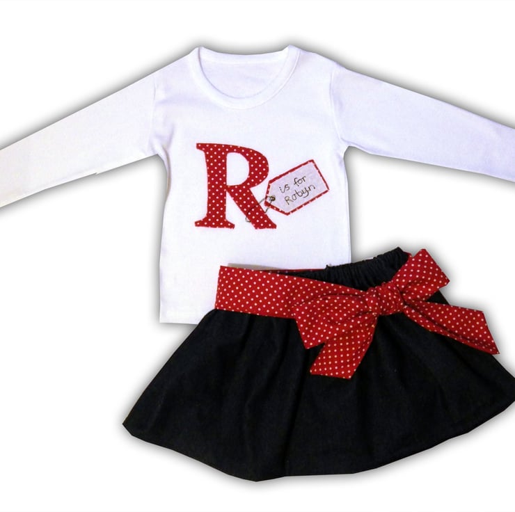 A beautiful handmade outfit consisting of a fun skirt and an appliqued personalised alphabet t-shirt.