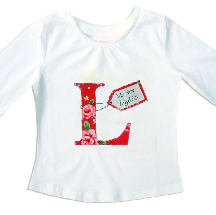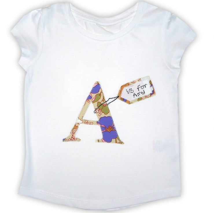 T-shirt is appliqued with the first letter of a name and a little tag, which reads ..(insert letter) is for .......(insert name)
