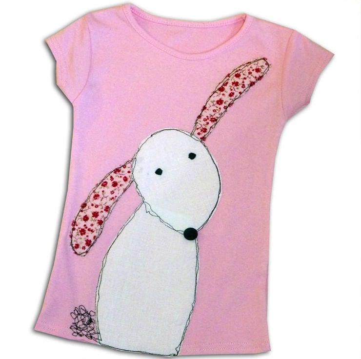 A fun short sleeved t-shirt , appliquéd and machine embroidered with a cute little bunny, finished off with a button nose.