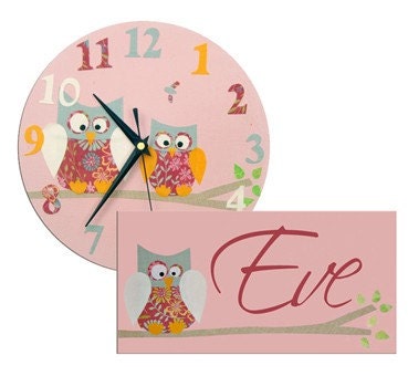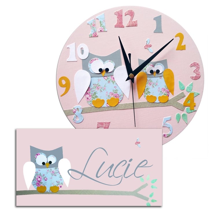 Owl Clock and Personalised Door Sign Gift Set, Owl Nursery Decor