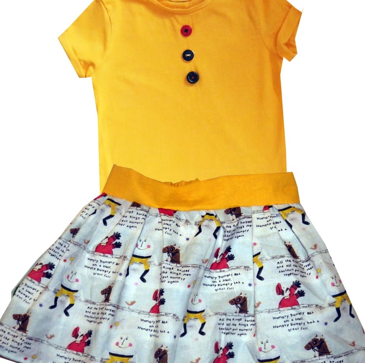 This fun skirt is made out of cotton Humpty Dumpty print fabric. The skirt has a yellow elastic waist band at the back to ensure a good fit.