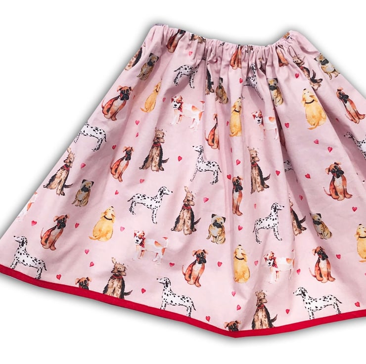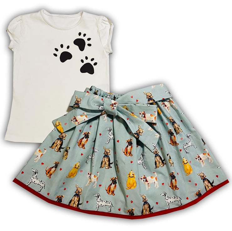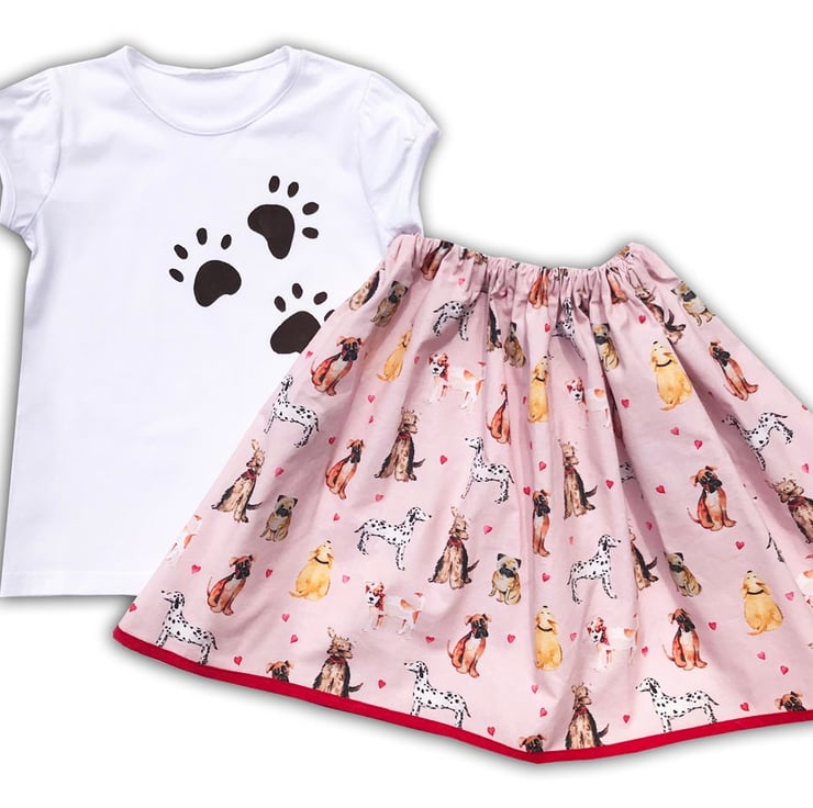 This fun outfit includes a dog print skirt and a t-shirt printed with cute paw prints.
