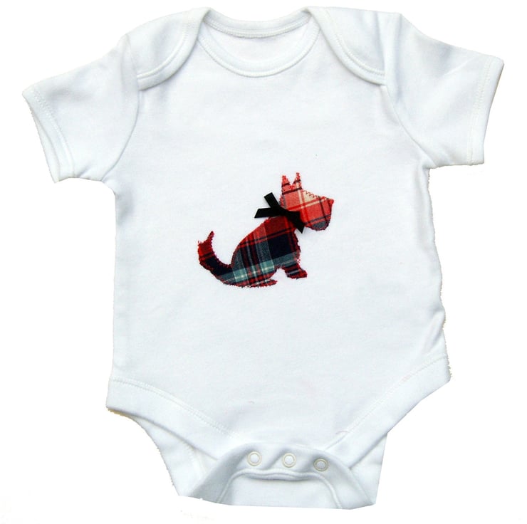 A fun babygrow featuring a Scottie dog and finished off with a little black bow