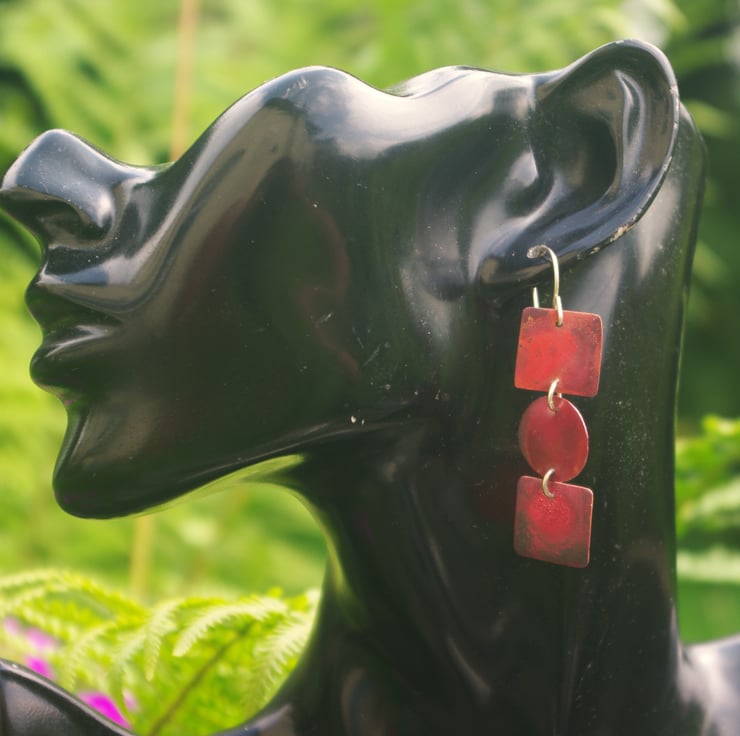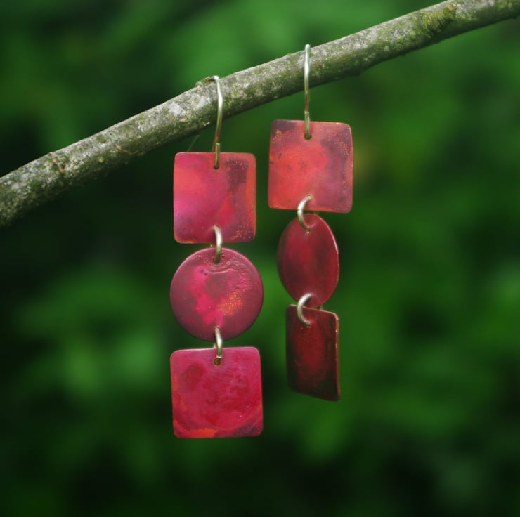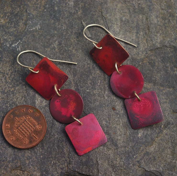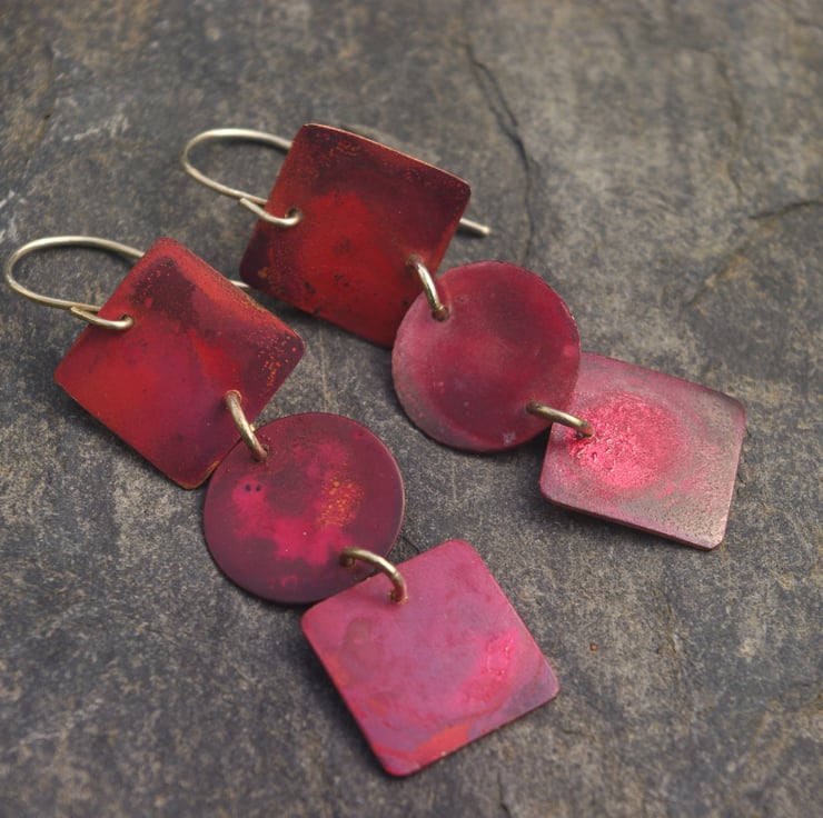 2 copper squares with a circular disc in between , turned into a pair of exciting pair of statement earrings . They have with tones of red, dark red, purple and some red/orange and have a slightly textured surface . This is achieved by applying heat; the colours preserved with a penetrating wax preservative. The squares are 15mm in diameter and move about freely. They hang from handmade sterling silver ear hooks and the total dangle is nearly 60mm/ 2.25 inches.