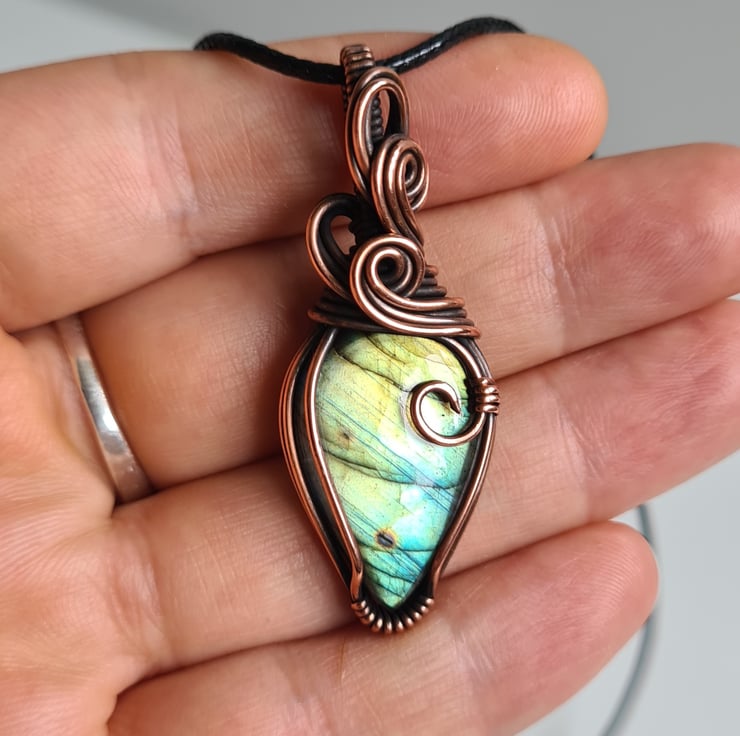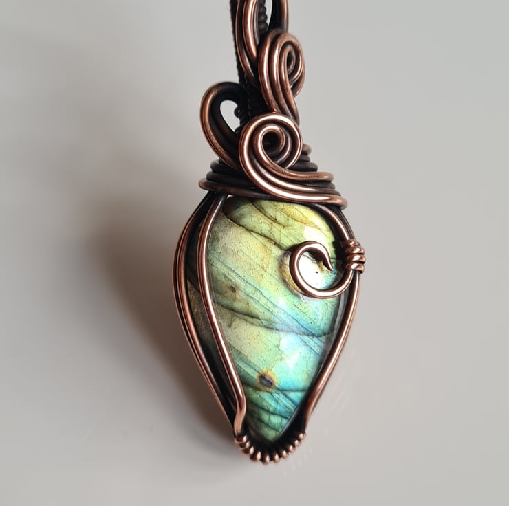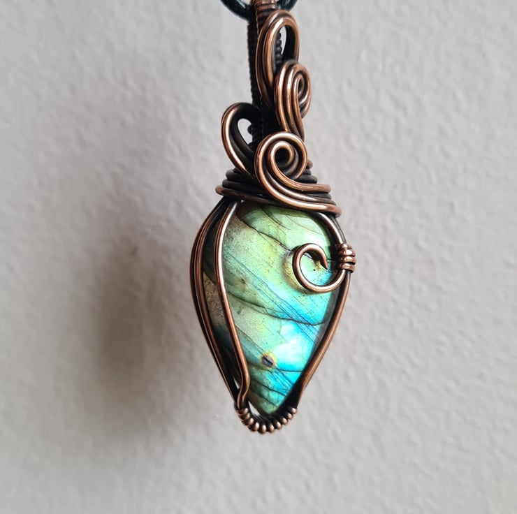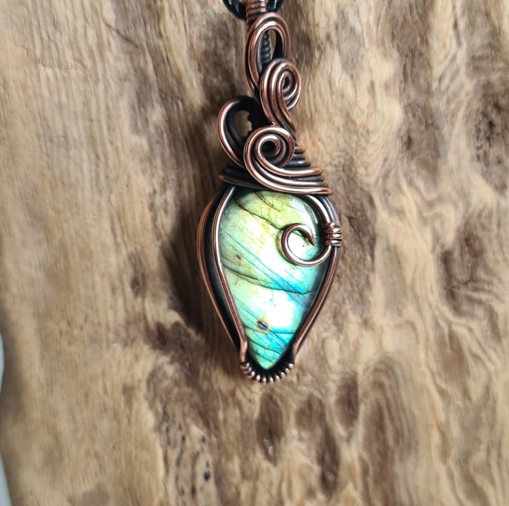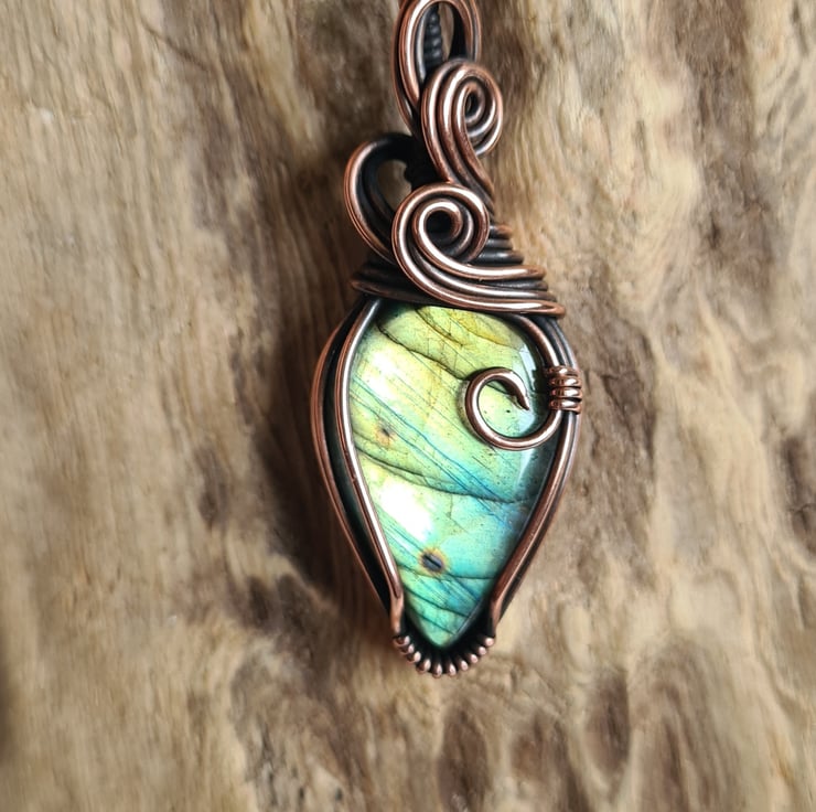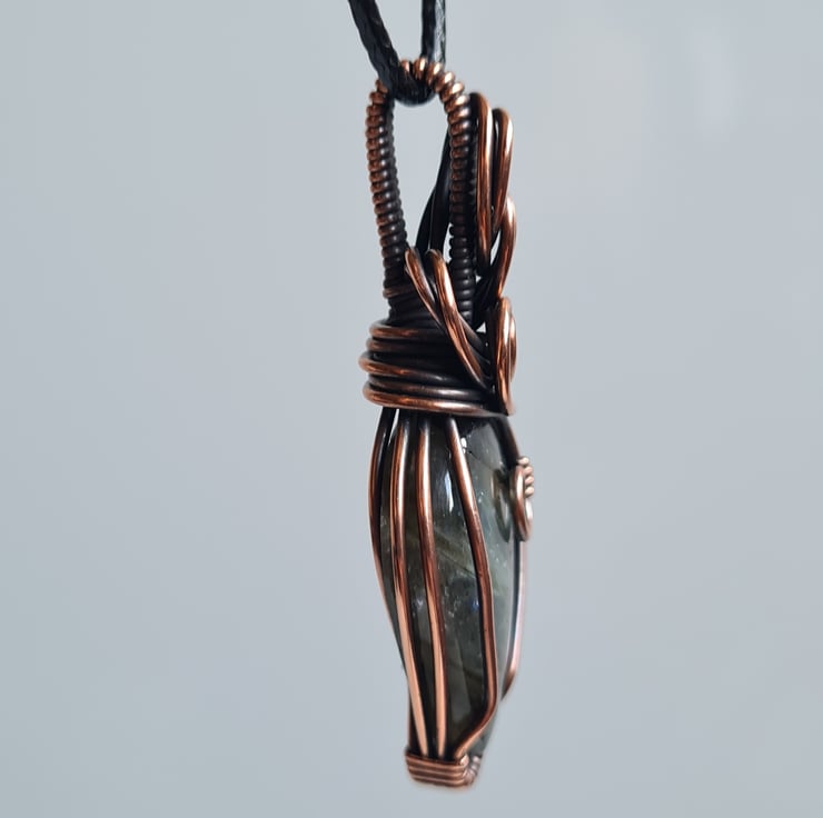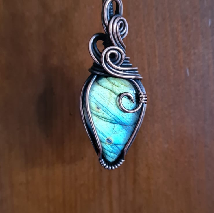 This lovely Natural Labradorite crystal is a beautiful mix of blue and green and has lots of flash to the stone. I have wrapped it with copper into this unique design and then antiqued and polished for the final effect. The labradorite has a lovely energy and feel to it, looks amazing against the copper, and is a ideal unique, one of a kind crystal gift.
