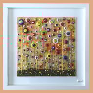 It took me hours to position the huge number of flowers. Each flower was put on by hand using glass frit (a labour of love). The background glass colours were overlaid onto the reverse of the picture, giving a very slight 3D feeling to the composition and also softening the composition. To give this picture a wee bit of bling I added dichroic glass to the centre of each flower.