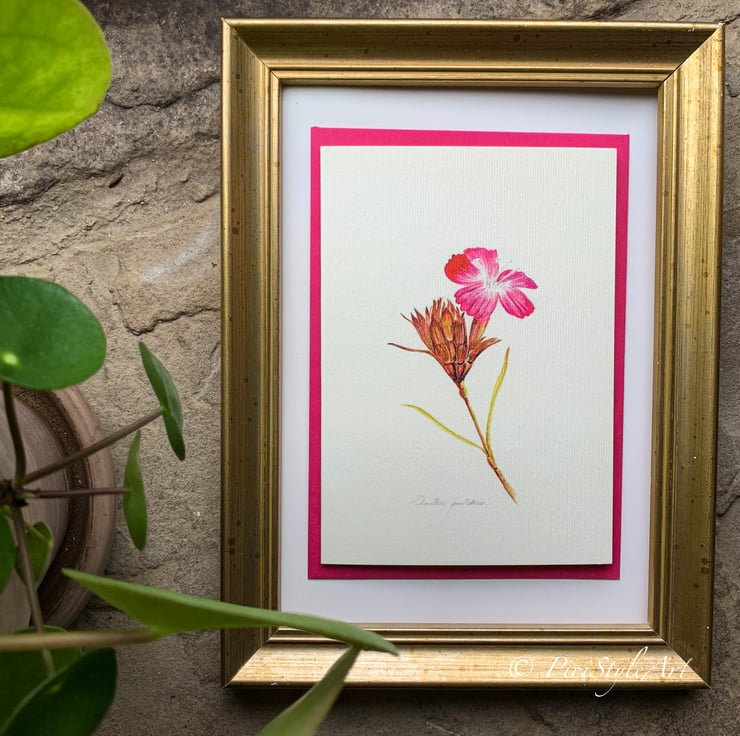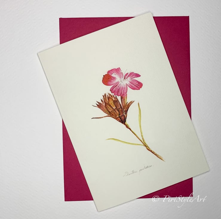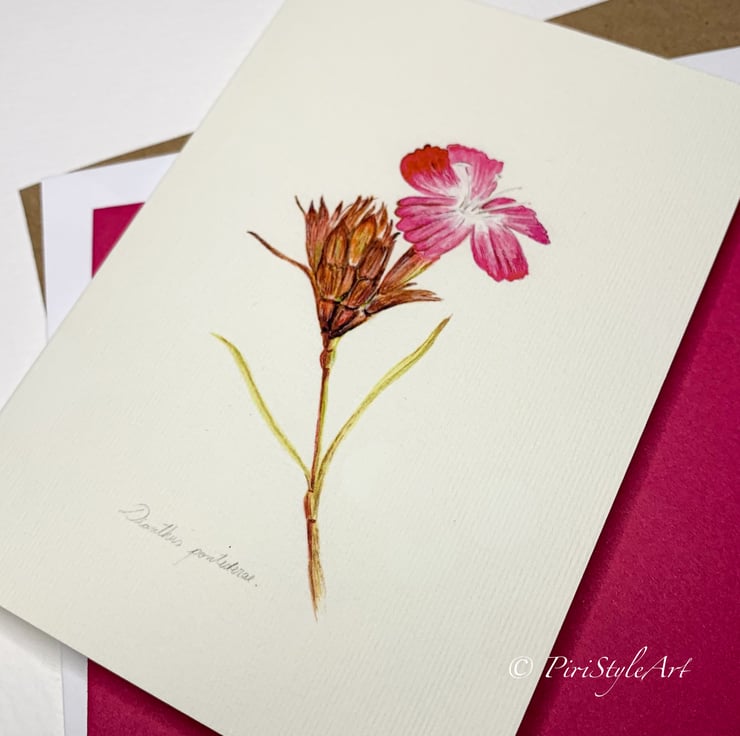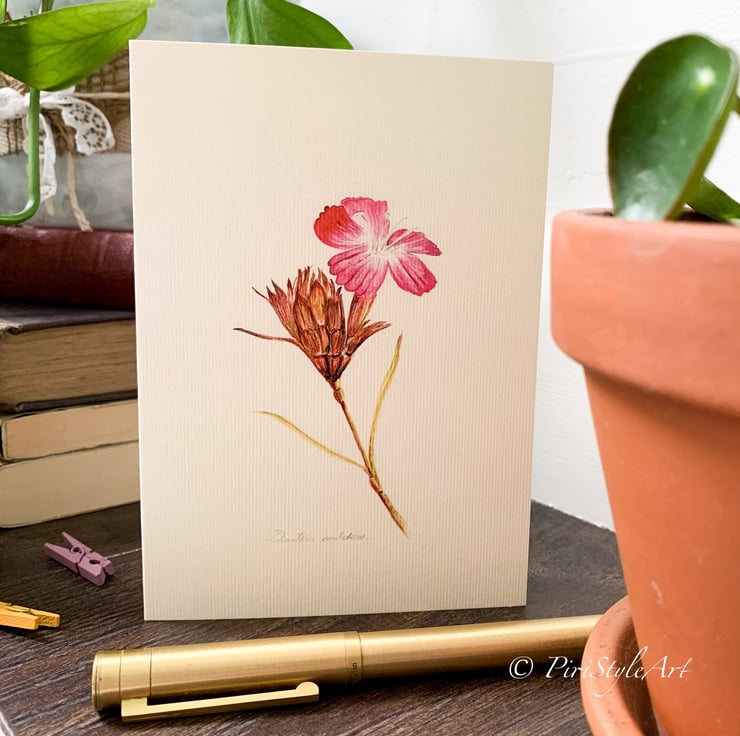 A sentimental design featuring my original Dianthus pontederae watercolour illustration, painted for my series of Pinks and Greens. This delicate wildflower is filled with personal meaning. The name "Dianthus" originates from the Greek words dios (meaning "god") and anthos (meaning "flower"), which together translate to "flower of the gods."