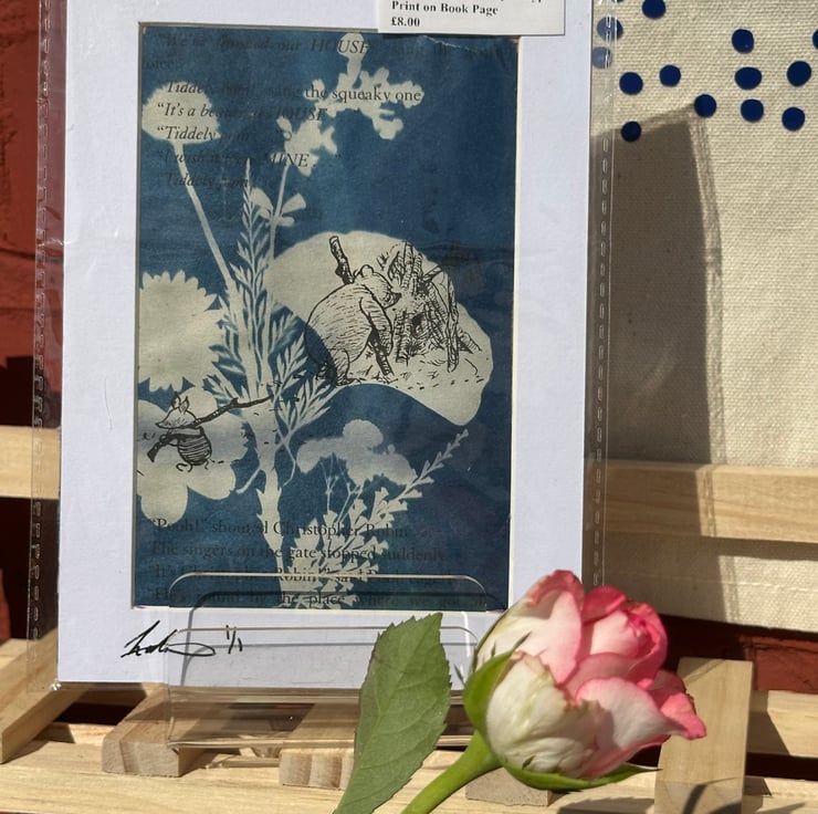 This unique botanical cyanotype is created using real plants carefully arranged and printed on a genuine page from A.A. Milne’s classic Winnie the Pooh. The combination of natural forms and nostalgic text makes for a truly special piece of handmade art.