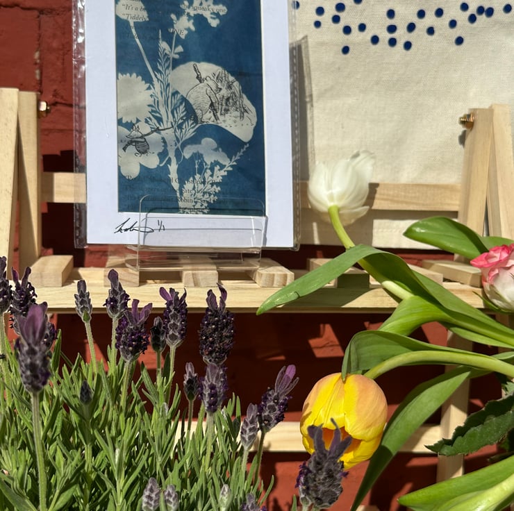 Cyanotype is a slow, meditative process that uses sunlight and time—just like a walk in the woods. I gather leaves, flowers, and ferns, arrange them thoughtfully, and expose them onto original pages from vintage Winnie the Pooh books. The result is a blend of story and nature, memory and moment.