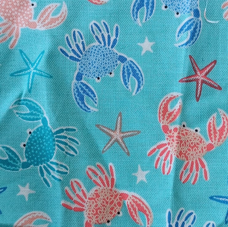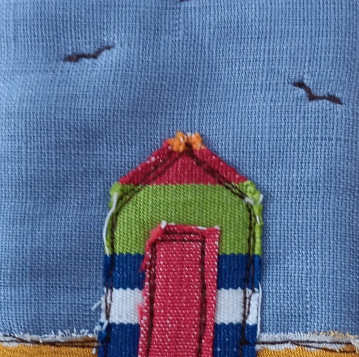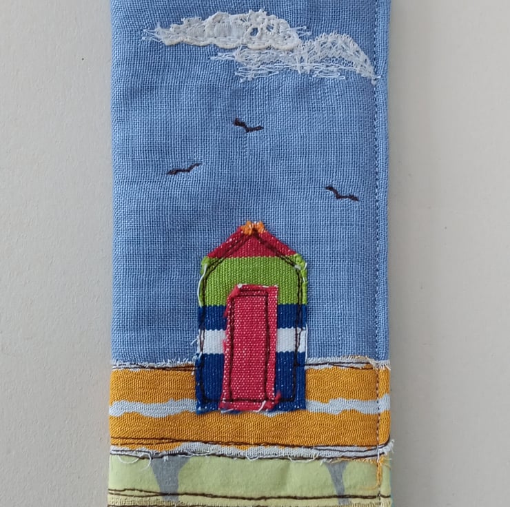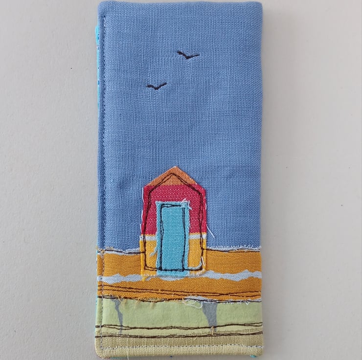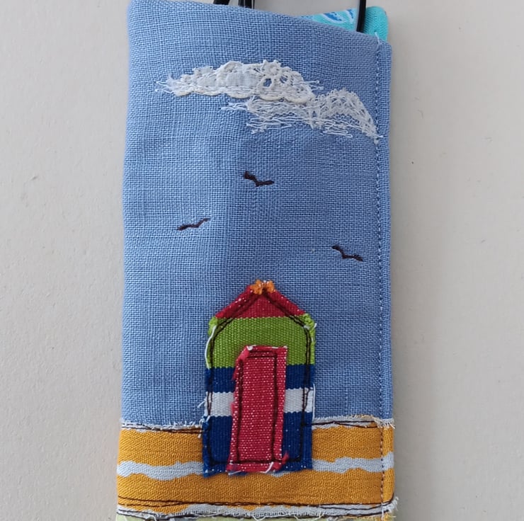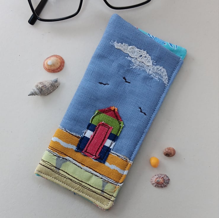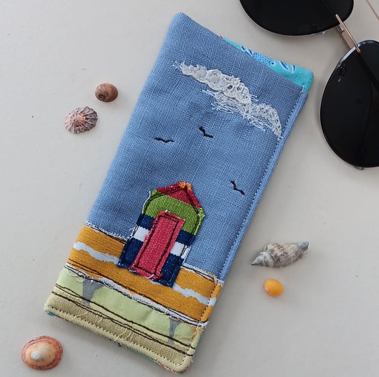 A cheerful glasses case with beach scene, ready to get you in the holiday mood. This is a soft, but slightly padded fabric case, with a scene of beach huts on the sand. It is made by appliqueing small snippets of fabric and lace onto a lovely light blue linen and stitching them using free motion embroidery. The scene continues onto the back of the case. Inside is a fun crab and starfish cotton lining. Ideal for the summer holidays, or just to give you that beach holiday vibe all year round.