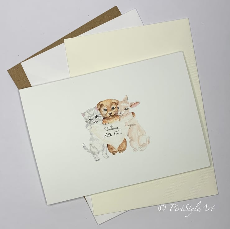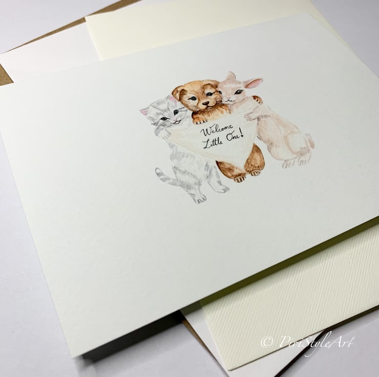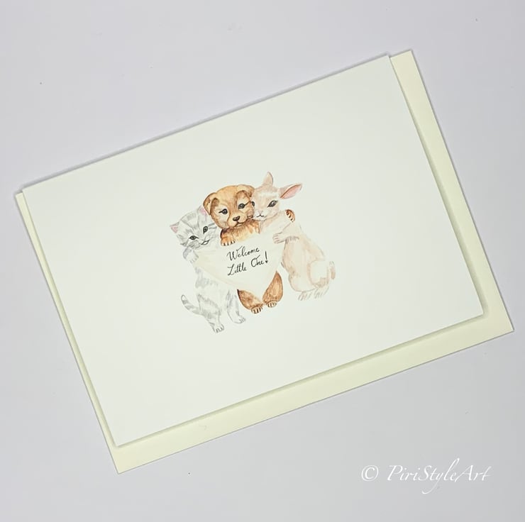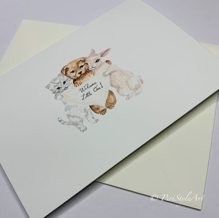 A gentle and heartfelt card to celebrate the arrival of a new baby, featuring my original watercolour illustration of three sweet baby animals - a kitten, a puppy, and a bunny -nestled together in a soft, loving hug. They hold a tiny sign that simply says: “Welcome Little One.”