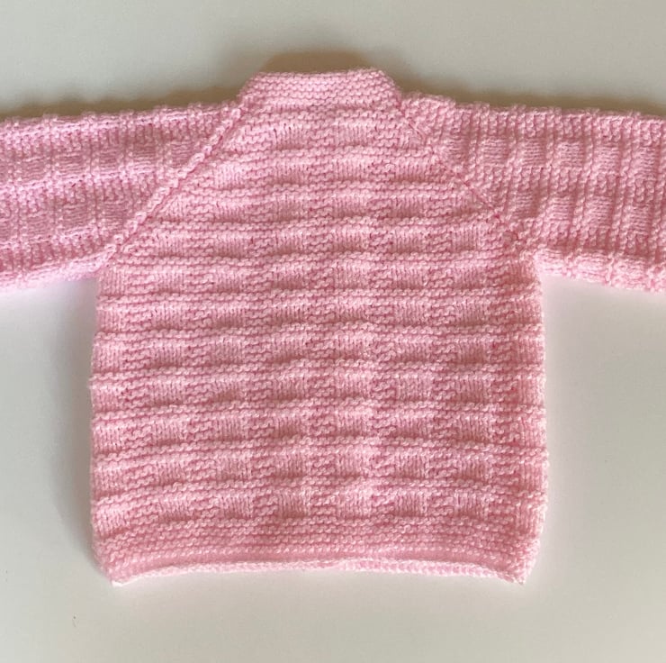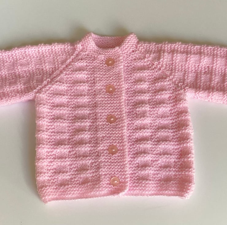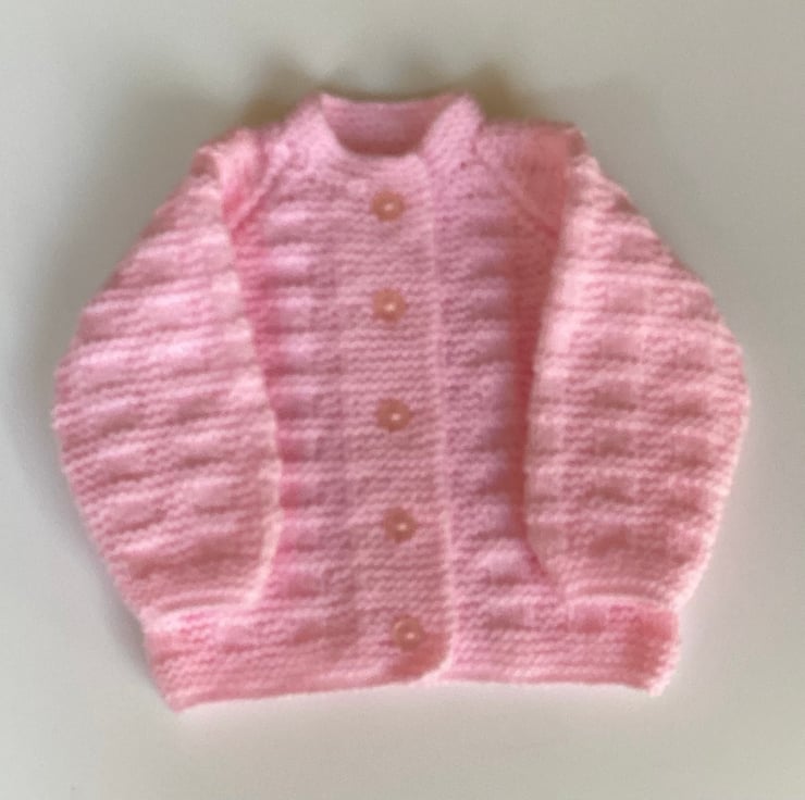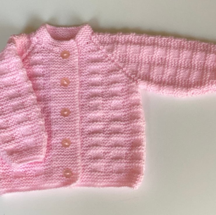 Pink baby cardigan hand knitted by me in my smoke and pet free Suffolk home. I have used a lovely soft baby yarn to knit this cute little girl’s cardigan and I have followed a vintage pattern for this traditional raglan style. Fastens with five matching pink baby buttons. Made to fit a little one from 6 to 9 months approximately, but please use these actual garment measurements to guide you.