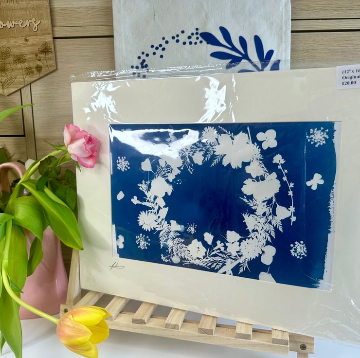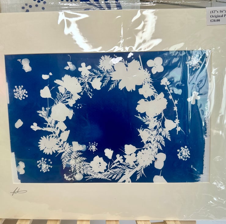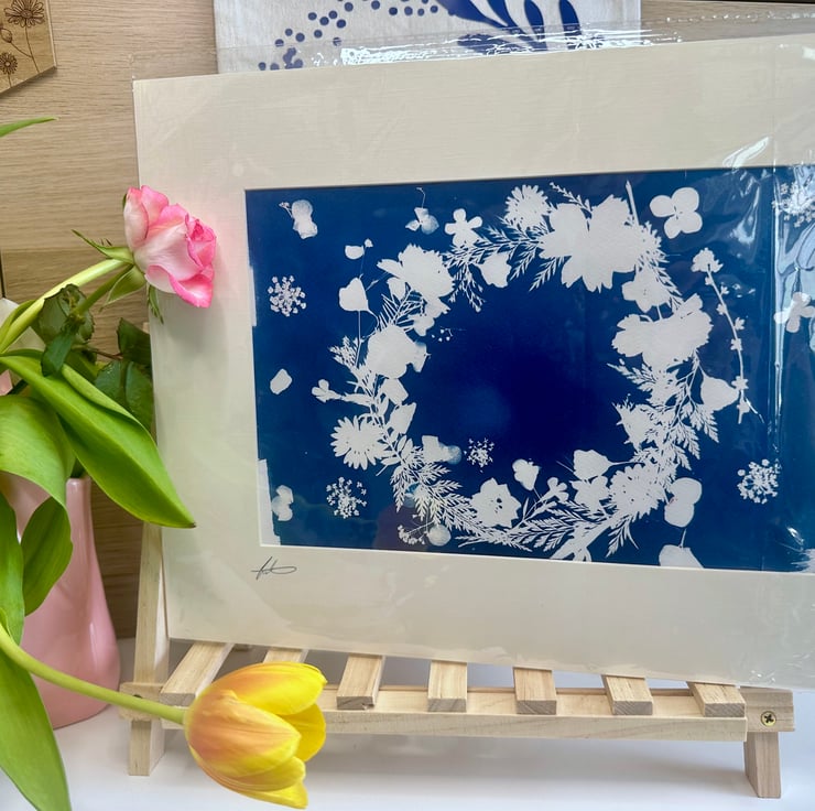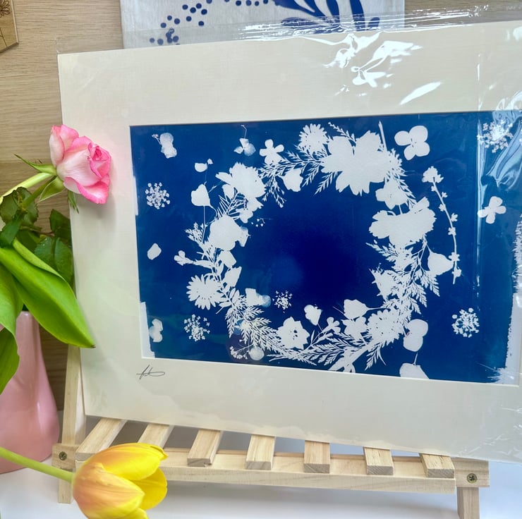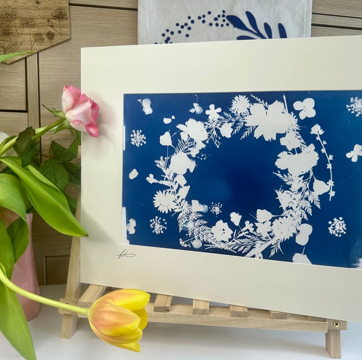This is an original handmade cyanotype print, created using real pressed flowers and foraged foliage, carefully arranged into a delicate circular wreath.