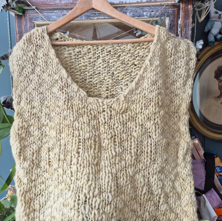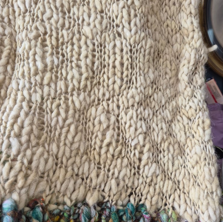 My knits are hand knitted by me using seasonally dyed wool and large needles.