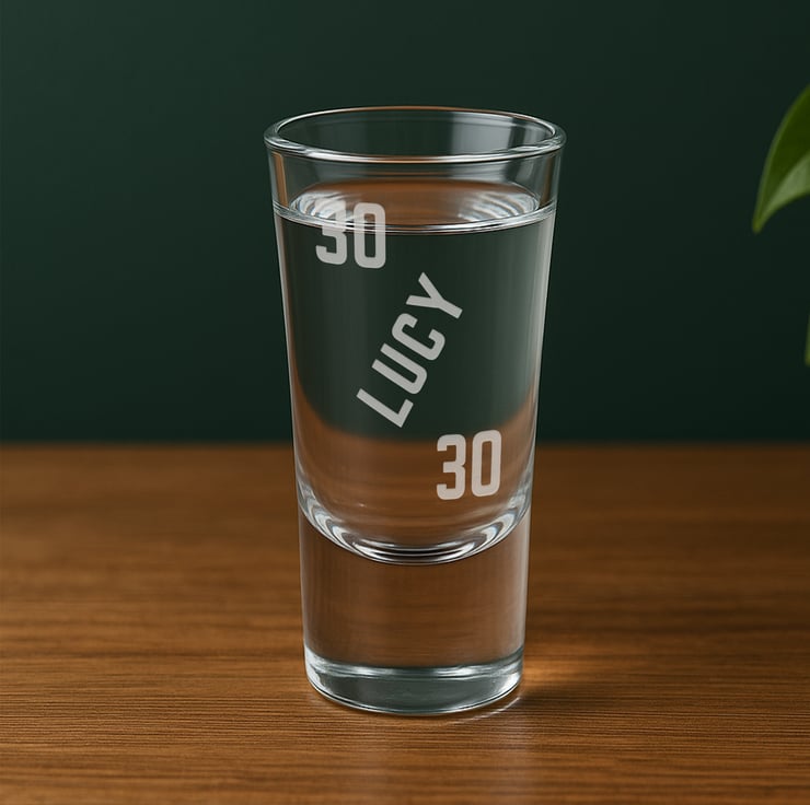 Mark the moment with a bold and modern keepsake. This custom engraved shot glass features a striking diagonal name and mirrored ages on either side. Personalise with any age and a name up to 8 characters to create a memorable and stylish birthday gift for friends, family, or party guests.