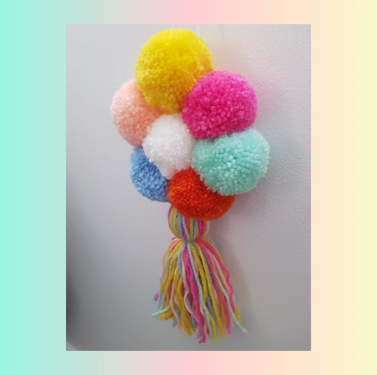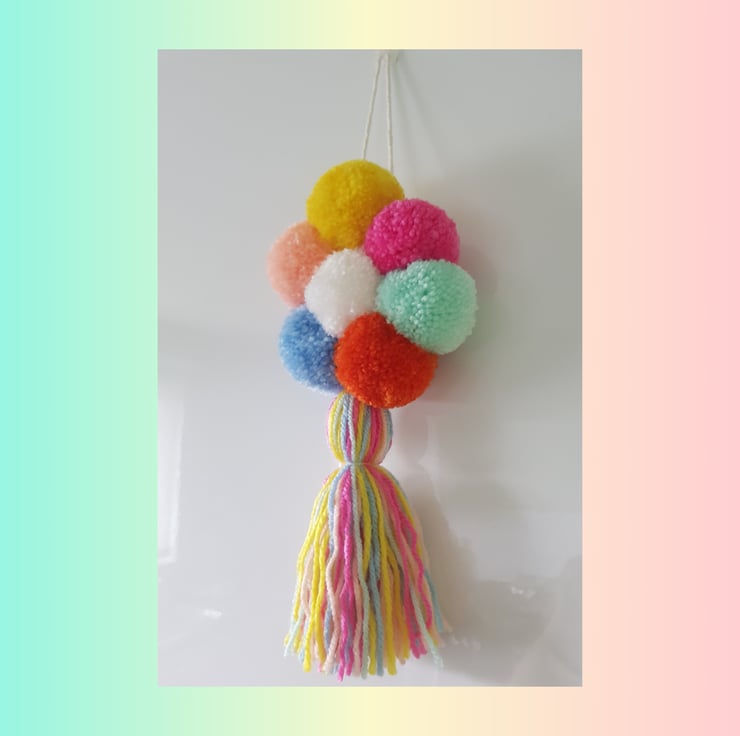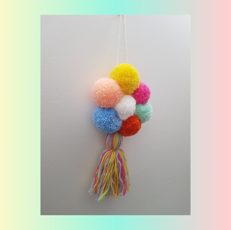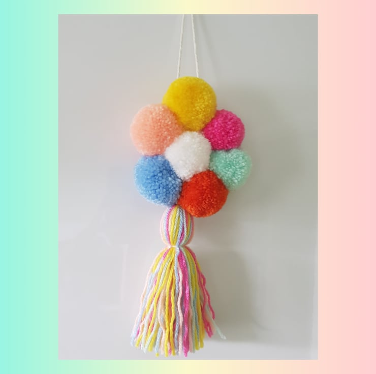 Add a joyful splash of colour to your space with this handmade pompom flower hanging. Crafted with care, this cheerful piece features 7 fluffy pompoms arranged into a flower shape, finished with a rainbow yarn tassel and natural cotton hanging cord.
