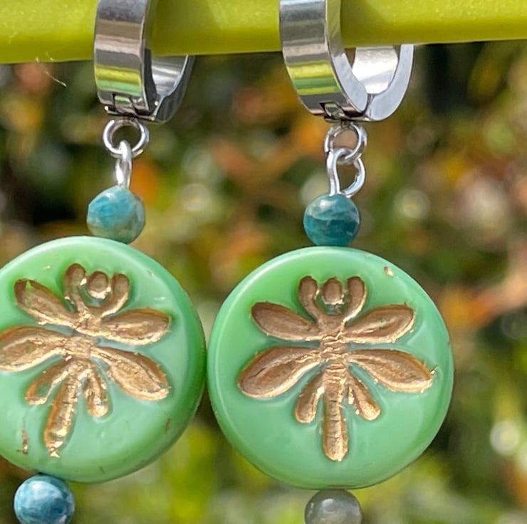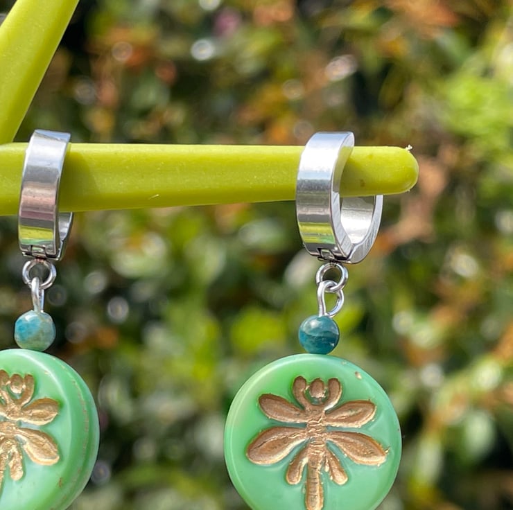 Mint green dragonfly earrings Czech glass silver tone aquamarine apatite huggie