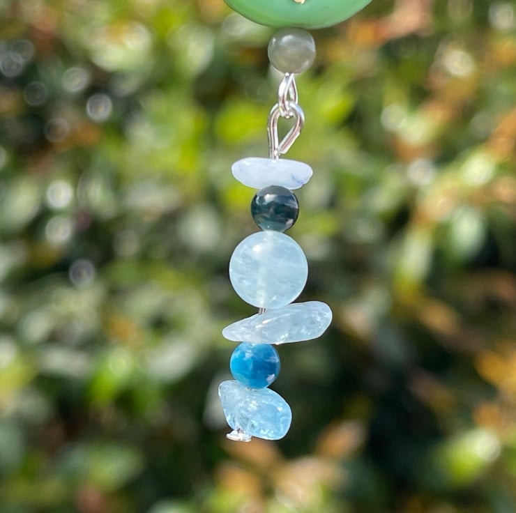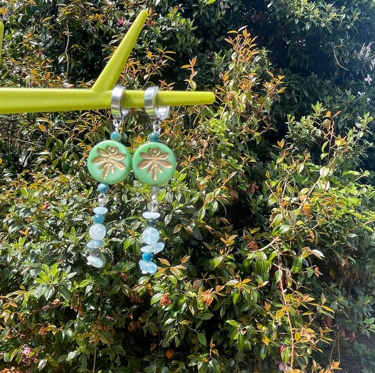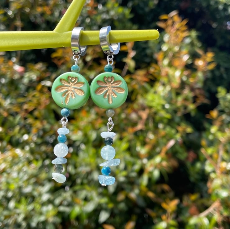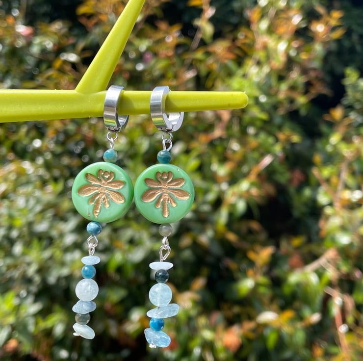 I've used two Czech glass dragonflies in lovely bright sea green and paired them with a lovely selection of aquamarine chips, apatite beads and an aquamarine bead l. I've finished off with stainless steel huggie hoops, keeping things simple