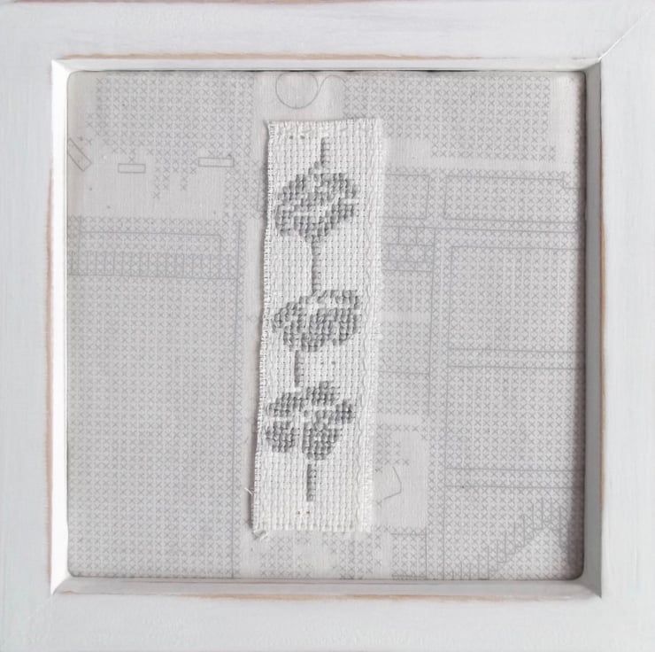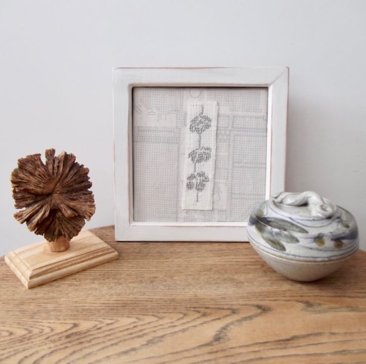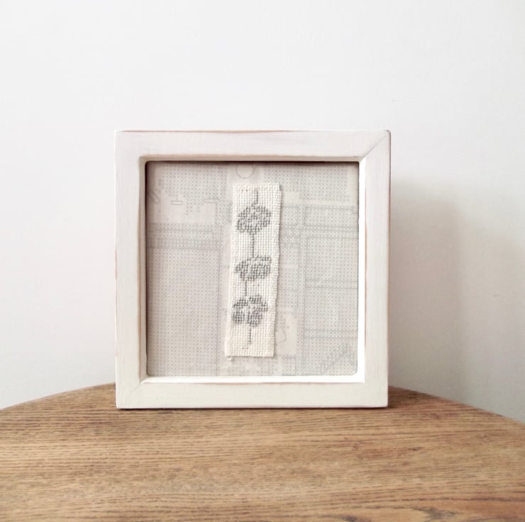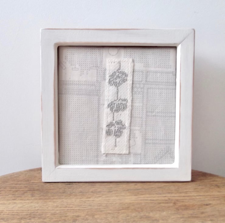 Framed in a shabby chic style white wooden frame hand embroidered cross stitch grey flowers strip mounted onto a vintage piece of cotton cross stitch pattern print grid fabric.
