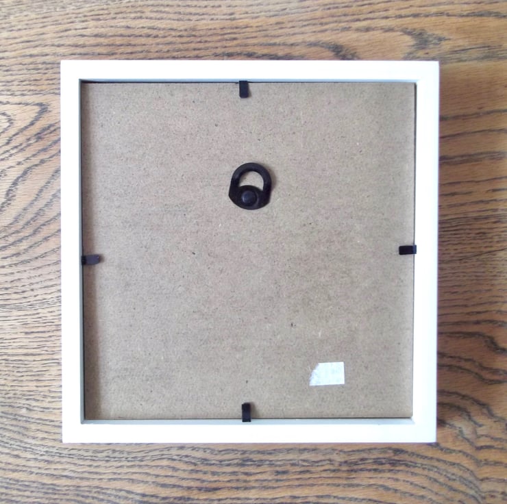 The wooden frame which has a small metal fixing for hanging. The frame has a glass front.