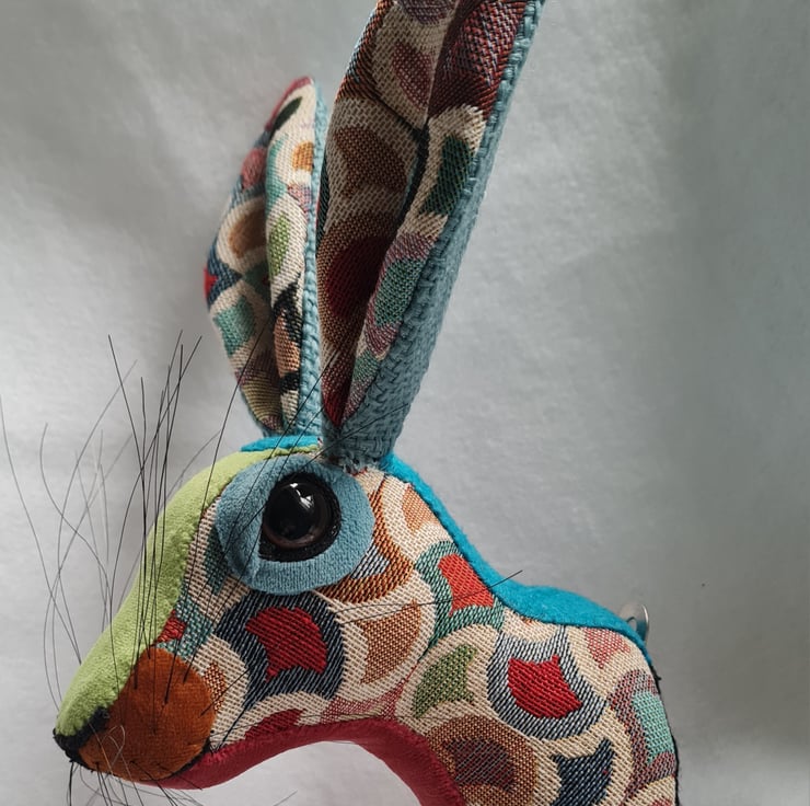 A lifesize faux hare which I have handmade and covered in hand stitched colourful tapestry fabric. The head is backed with felt and has a metal hanger to hang it on the wall. It is lightweight.