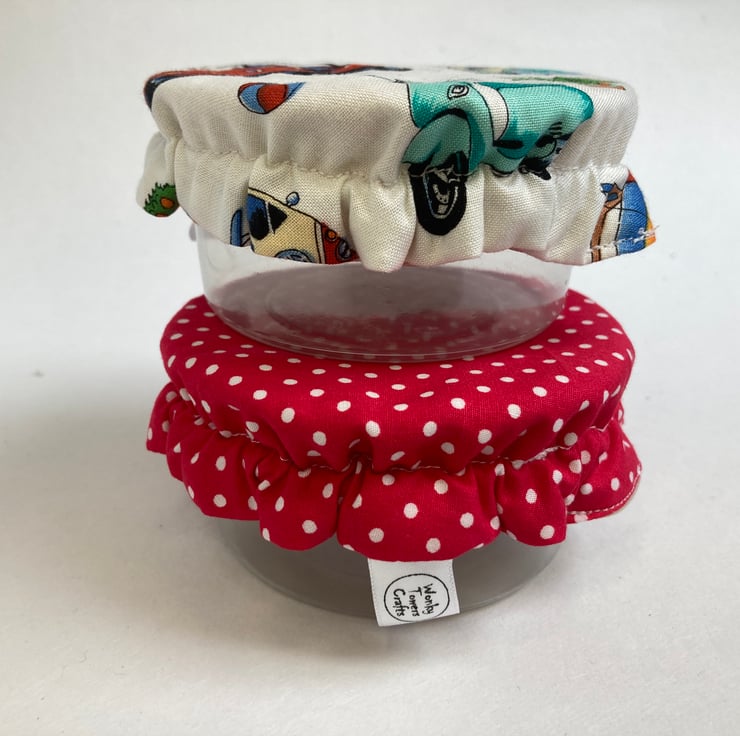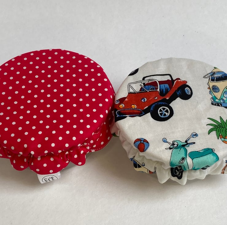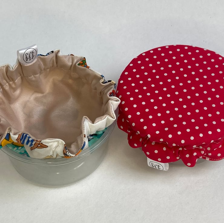 This smart pair of pot covers are made from coordinating cotton fabrics. One is a cream background decorated with camping images - camper vans, tents, deck chairs and so on. The other is a bright red polka dot fabric. They are lined with beige PUL - a fabric that is laminated with a small amount of plastic. It is safe to be in contact with food, helps to keep it fresh but reduces the need for single-use plastics. An elasticated rim keeps the covers securely in place on your chosen dish or pot. They are washable by hand or machine, making them a hygienic option and I find they are much easier to use than beeswax wraps. These covers will fit bowls and pots of approximately 9 to 11cm in diameter and the elastic means they will adapt to different shapes. If you are looking for something a bit bigger to fit olive tubs or that more expensive Houmous, topped with pine nuts, check out our other listings. Our ‘small’ bowl covers are perfect and we sell them as part of a multi-size set or as a set of 2 the same size.