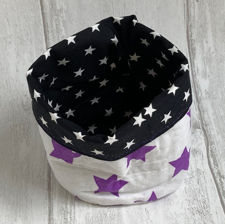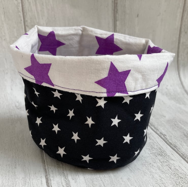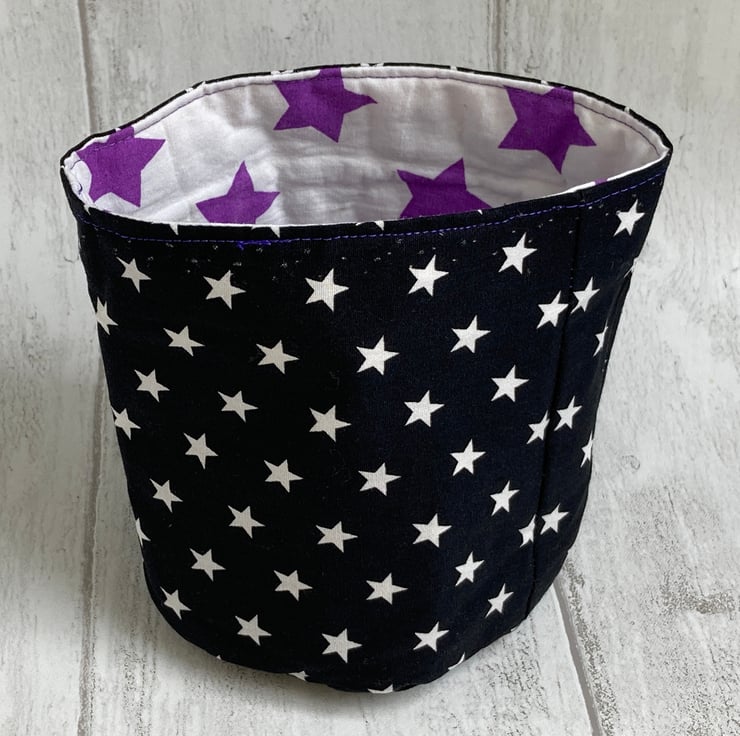 This small basket measures approximately 11 x 10cm. The basket is reversible so that you can ring the changes or just stick with your favourite. One side is white cotton decorated with purple stars. The other is black cotton decorated with white stars. Between them is a layer of polyester wadding to give shape.