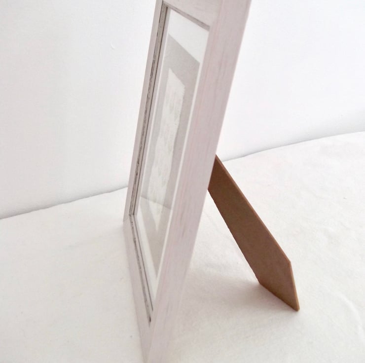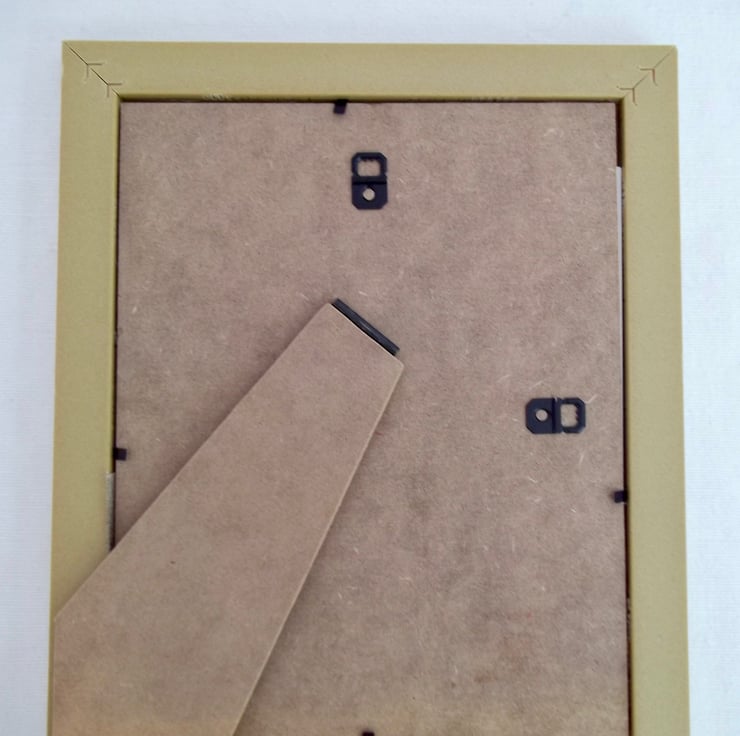 Polymer frame, which looks like a shabby chic wooden frame. Glass front with a stand and hanging fixture at the back, so you can either hang it onto the wall or place on a flat surface.