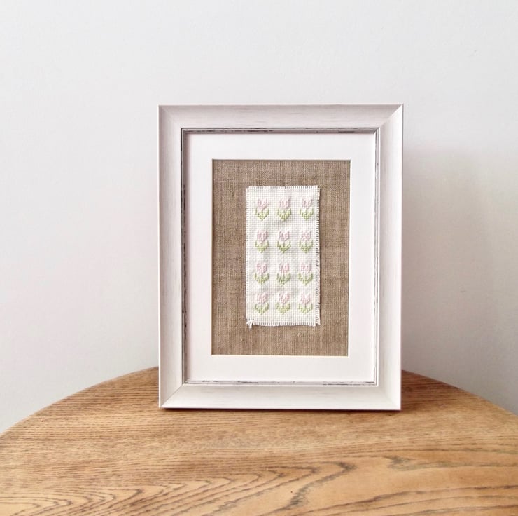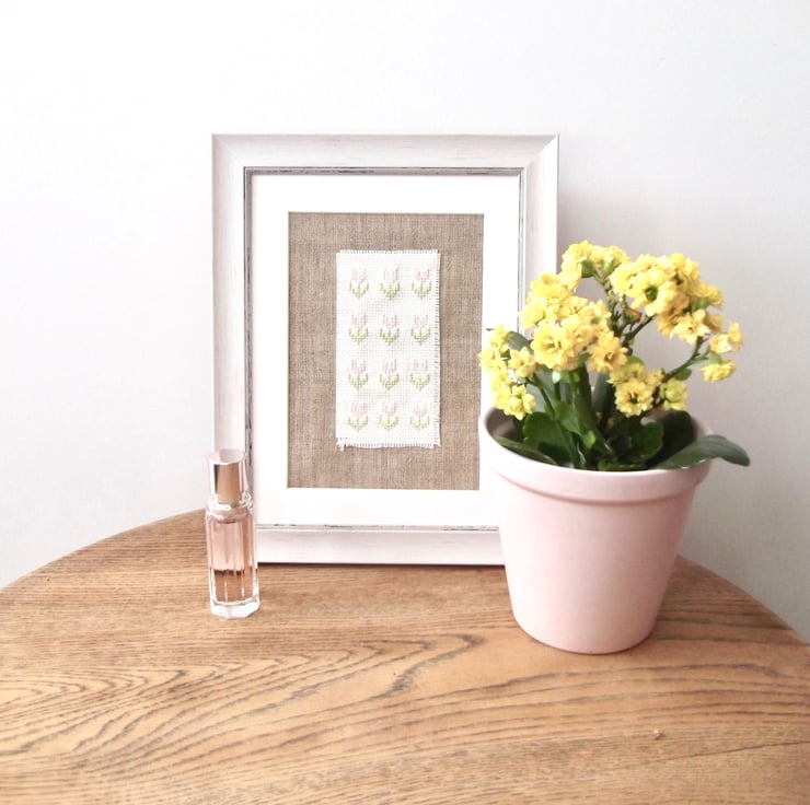 Light pink tulip flowers, cross stitched embroidery framed picture.