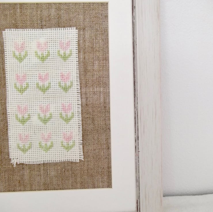 Using off cuts of cross stitch fabric from a (now closed) independent sewing shop, I was going through a cross stitch phase. In the doom and gloom of winter, it's nice to work on spring themed items.