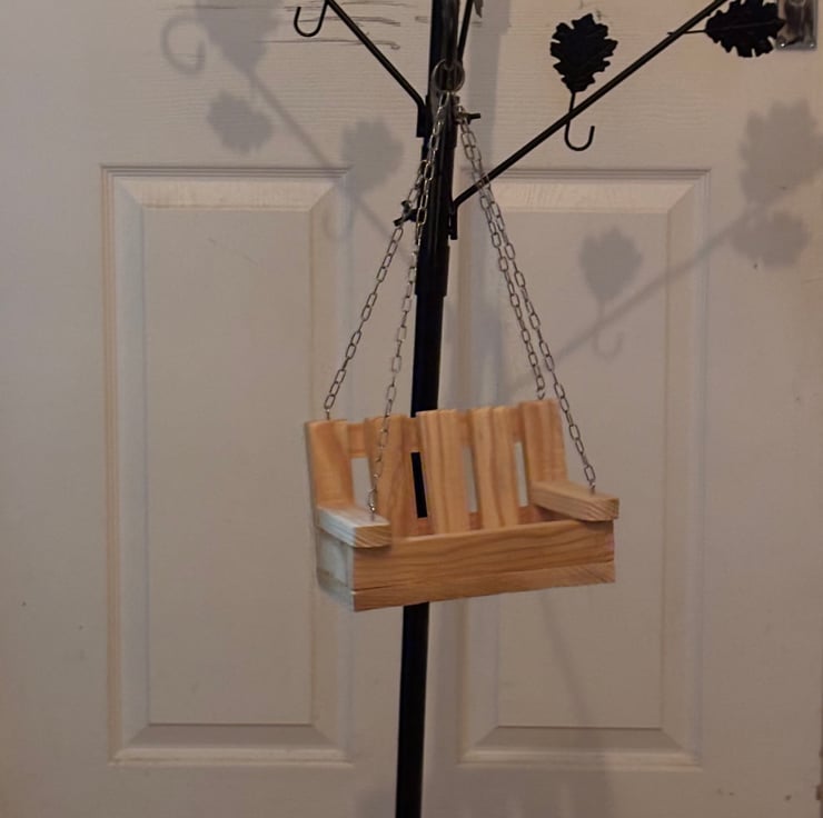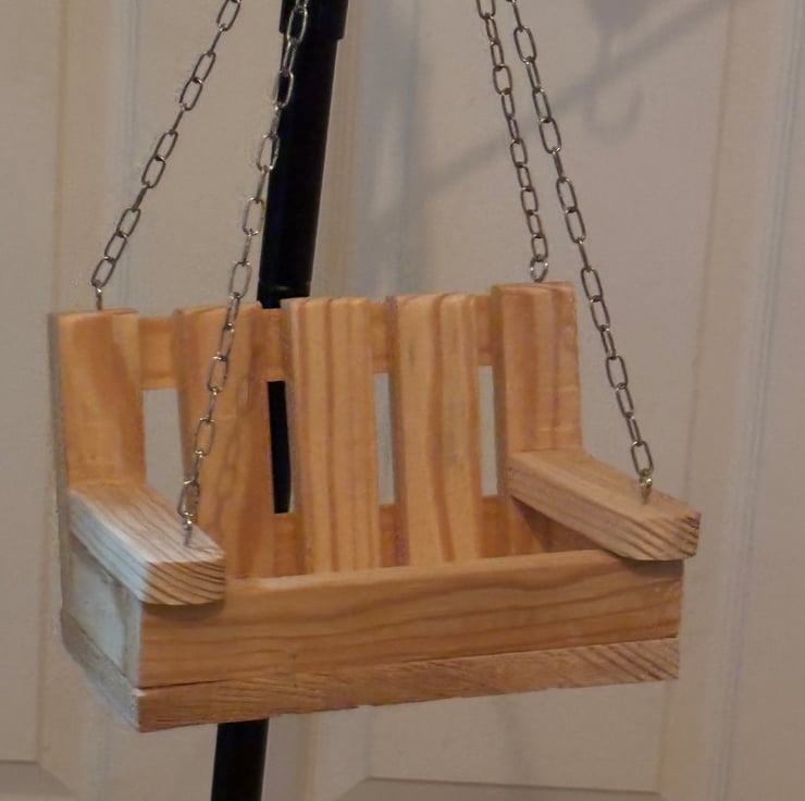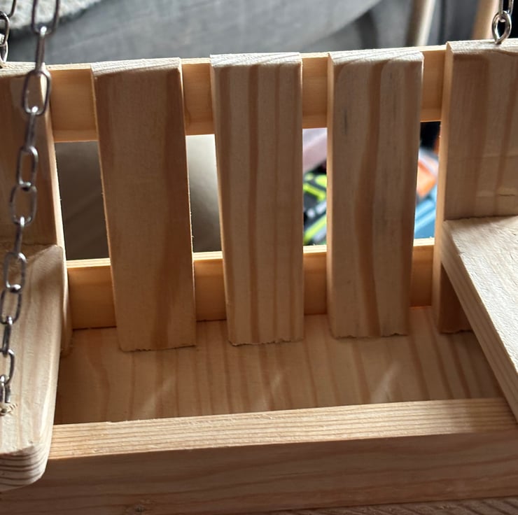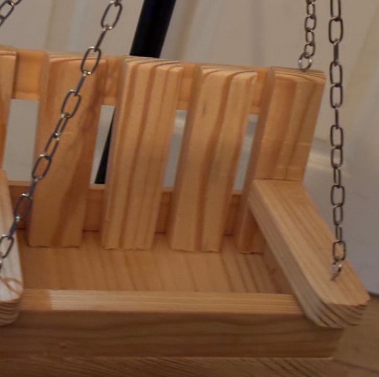 A hanging wooden bench bird feeder. Handmade by us in an our garden shed in Northamptonshire using larch wood. This item is ready for you to paint or leave natural.