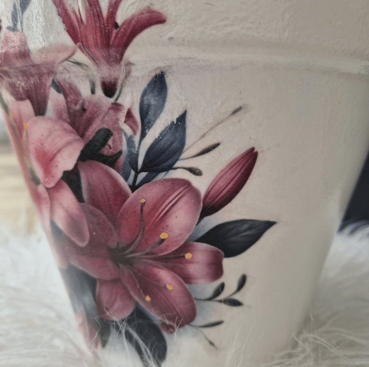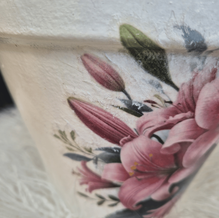Pink lilies are one of my favourite flowers, so I started looking for rice papers and found this gorgeous pink lily design which inspired me to decorate and bring a plain plant pot to life!