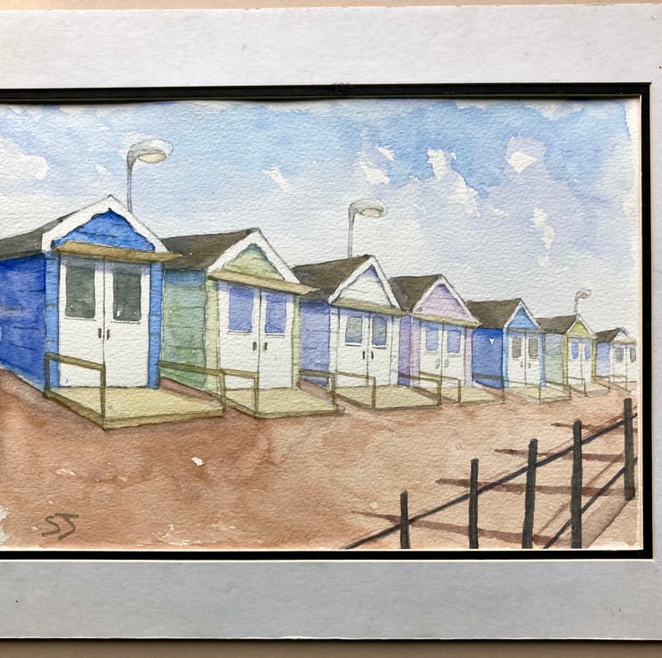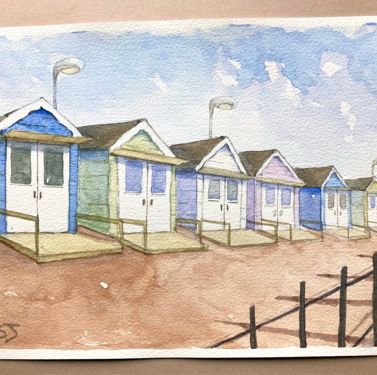 A bright and sunny watercolour painting of the beautiful original beach huts in St Annes on Sea. Great for a coastal house with pastel colours and brings that coastal feel to any room.