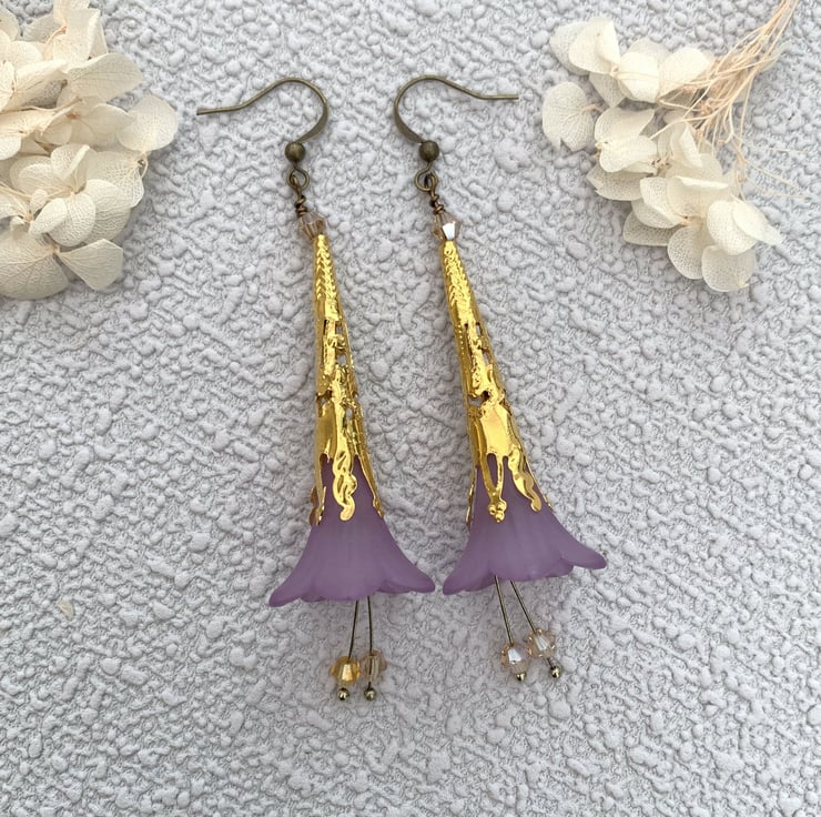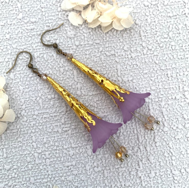 These charming earrings are made with pale purple lucite flower beads that are embellished with gold plated long bead caps. The earrings also have long drop stamens with tiny pale peach tone glass beads that move when the earrings are worn. The earrings are finished with antique bronze ear wires and they are 8cm in total length.