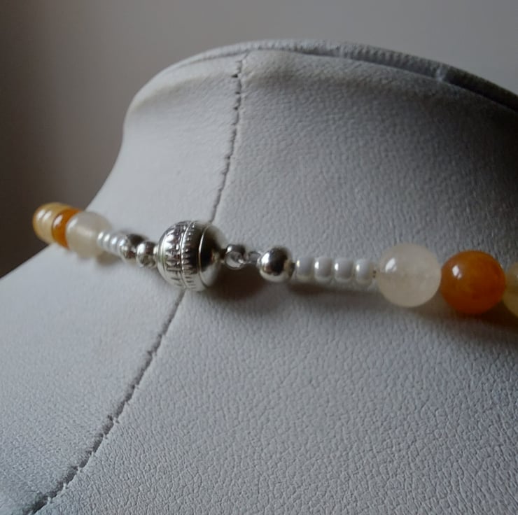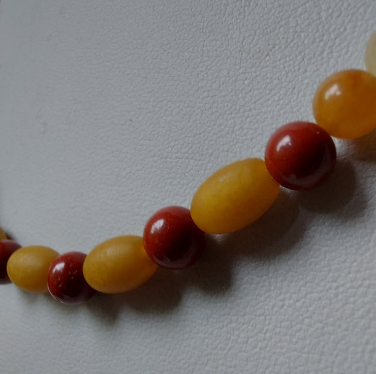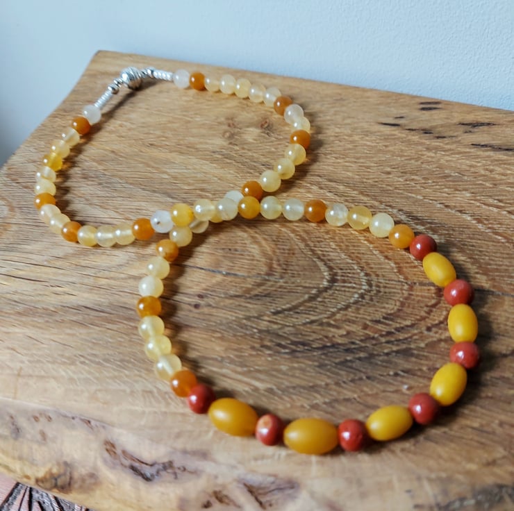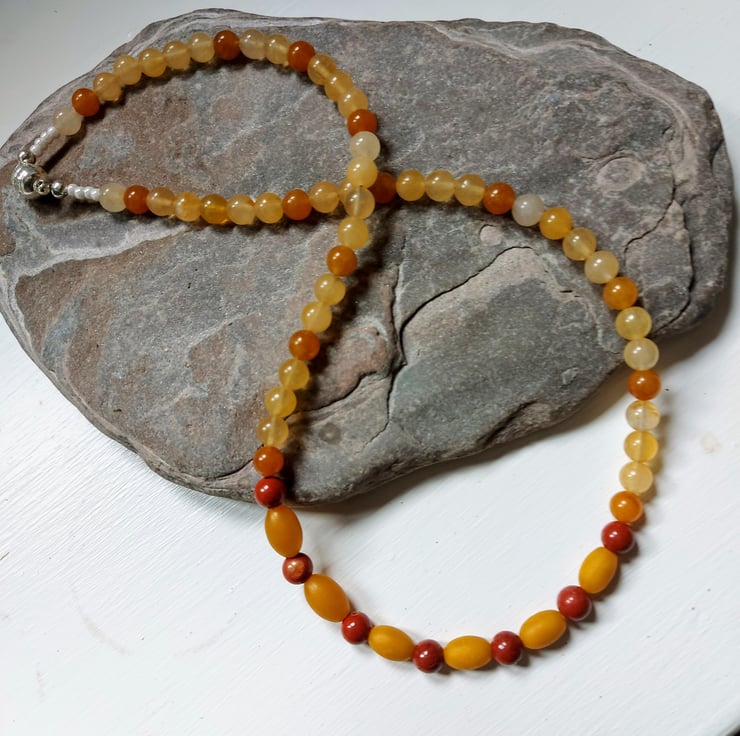 This colourful necklace is ideal for holiday wear. The beads used are mainly 6mm round beads of Jasper in colours ranging from white to yellow, orange and red. At the front I have added six oval beads of Amber, measuring 8x12mm. These are antique beads, yellow in colour but opaque with a matt finish. The beads are mounted on fine beading wire and the necklace is fastened by a neat magnetic clasp which is easy to use and very secure. The total length is 19 inches or 49 cm. This item will be packaged in a gift box or organza bag and sent by Royal Mail first class.