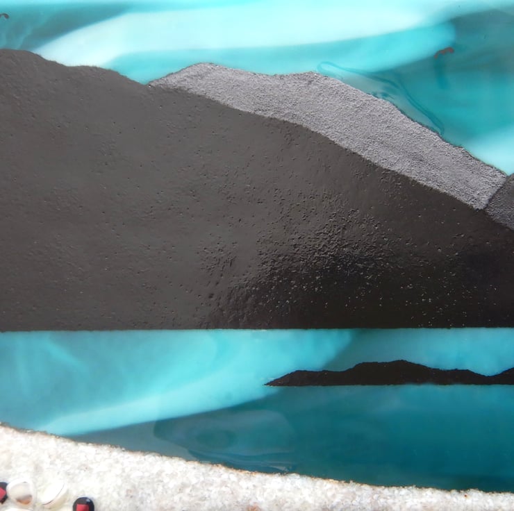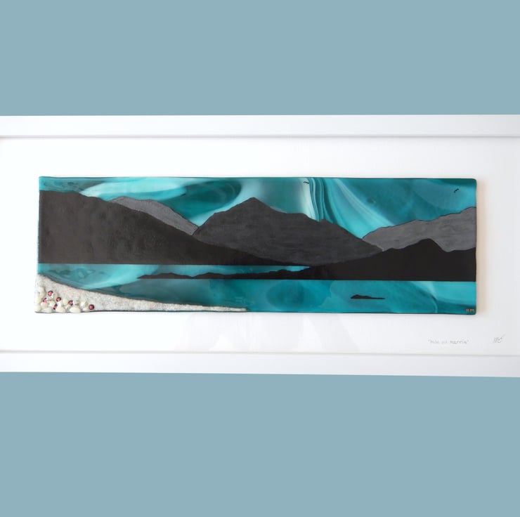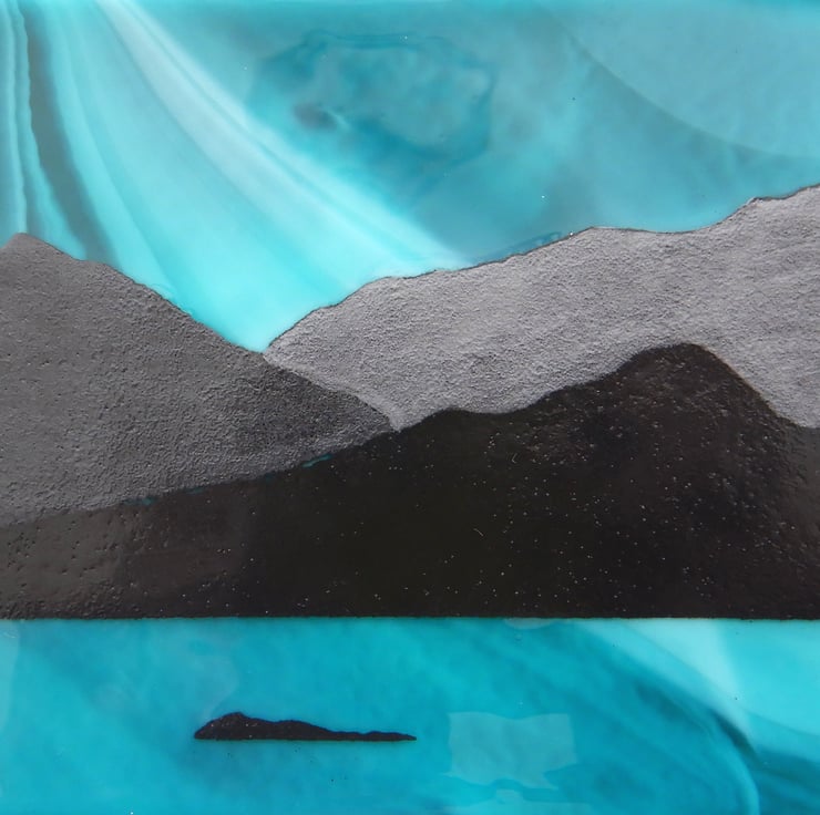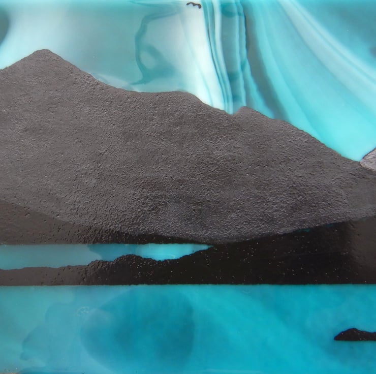 'ISLE OF HARRIS' is a subtle mix of swirling shades of white/blue/turquoise, with the mountains contrasted in black. The actual isle has been very carefully painted using finely ground powdered glass. The foreground is vanilla coloured glass frit set against the streaky blueness/turquoise of the sea. A tiny bit of bling has been added by scattering little sections of dichroic glass amongst the sand and rocks. Once the picture was completed it was then fused in my kiln at 1400 where all sections became one!