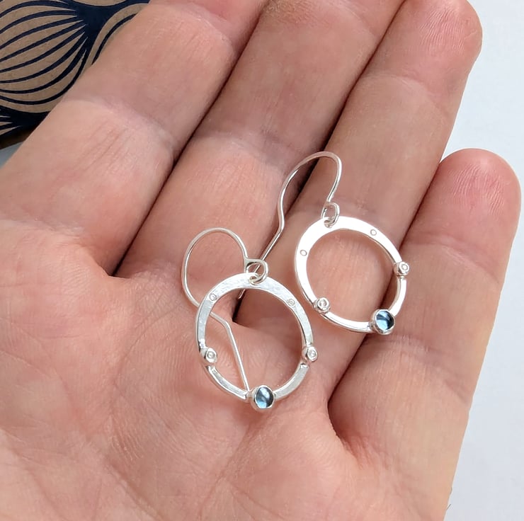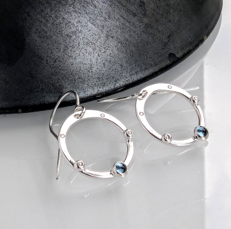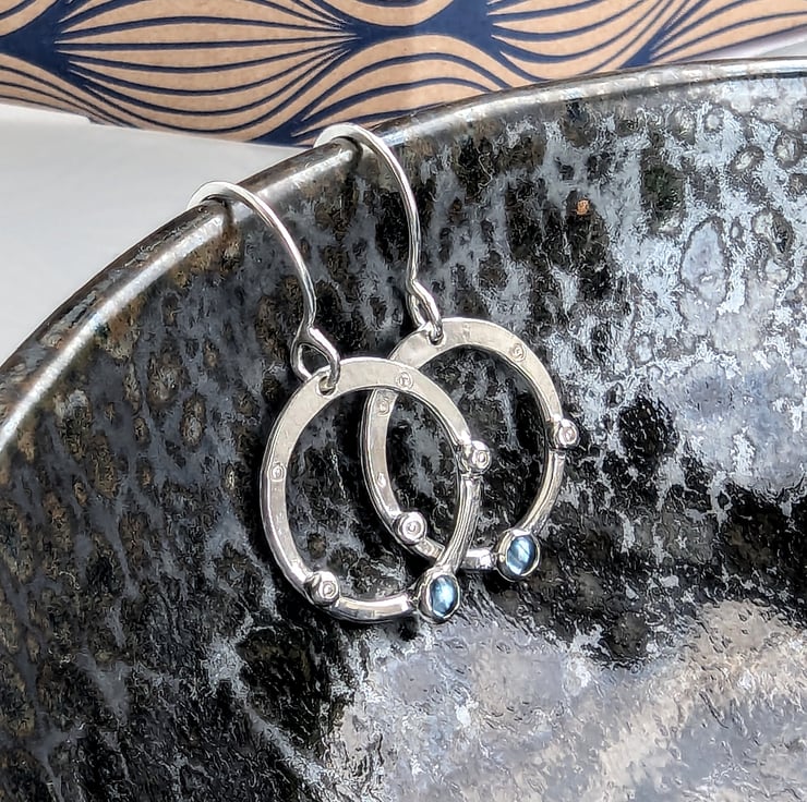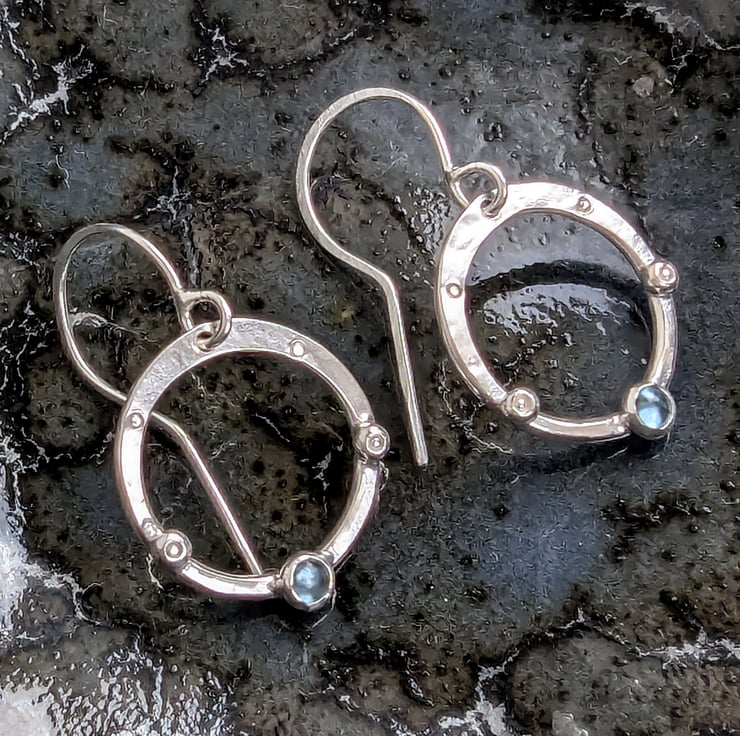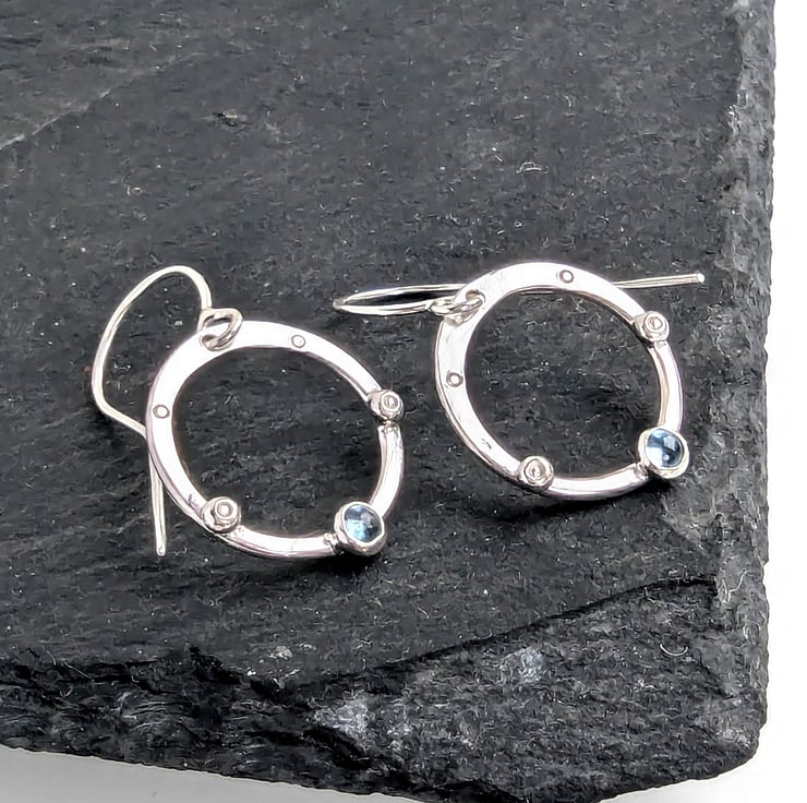 Small hammered 15 mm mis shaped hoops with 2 rivet designs and little 3 mm London Blue Topaz at the bottom of hoops