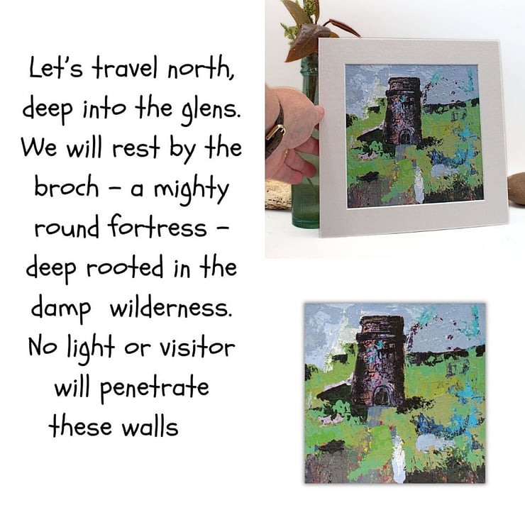 This is an original painting completed in acrylics. It depicts an old round broch in a remote area in Caithness, Scotland. The paint has been applied with a mix of painting knives and fine brushes. I've allowed the layers of acrylics to build up to give an impression of a solid fortress that has stood proud for centuries amongst densely packed growth.