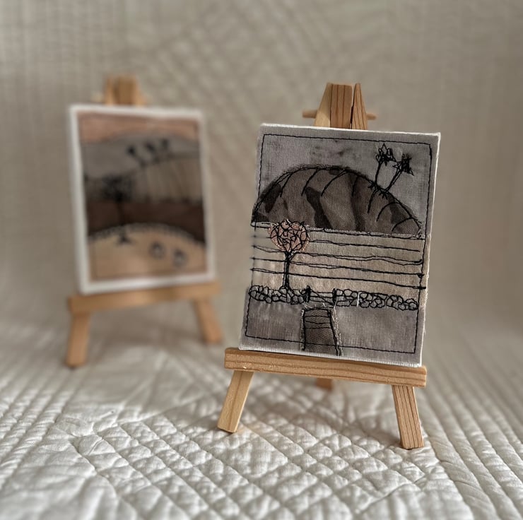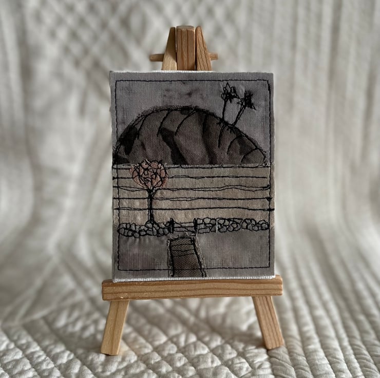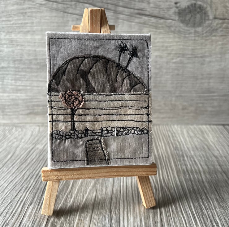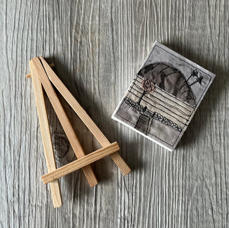 The textile art landscape is mounted on a small wooden easel. The easel measures 14cm x 8cm and the canvas, 9cm x 7cm
