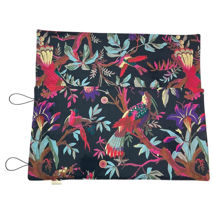 This case is made In the most gorgeous authentic Indian Hand block printed cotton fabric,in so many vibrant shades on a striking black background. Focal point is an ornate bird that I have fussy cut.