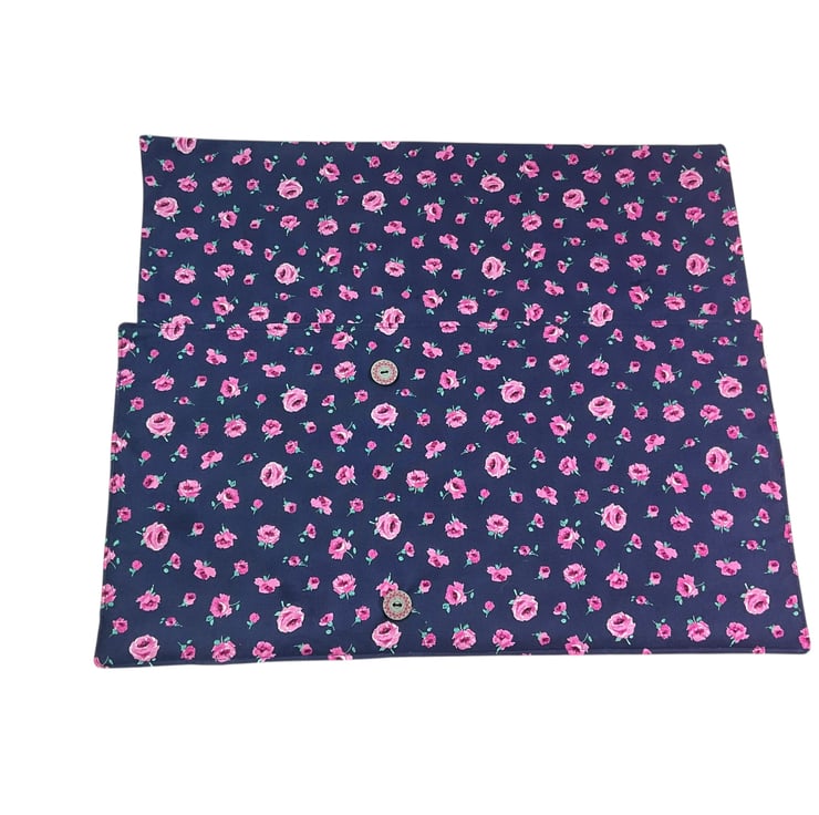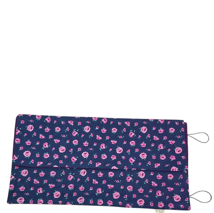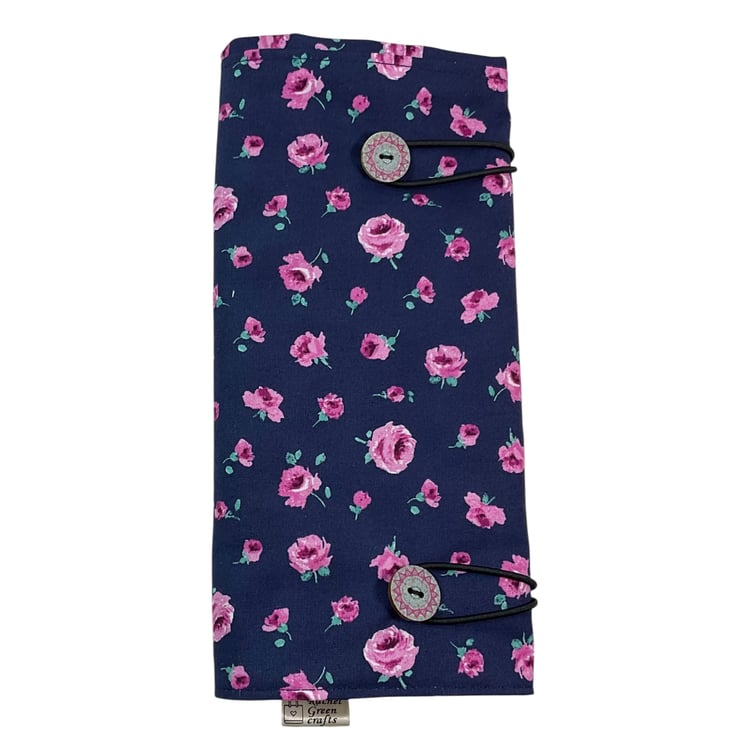 This case is made from The prettiest Liberty floral print Lasenby cotton which is a heavier weight than their tana lawn and therefore much more suitable for needle cases. This print is Mary rose a pretty pink roses print on a navy blue background. The case can also be used for straight needles up to 25.5cm (10") or maybe crochet hooks.