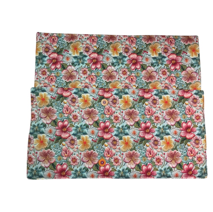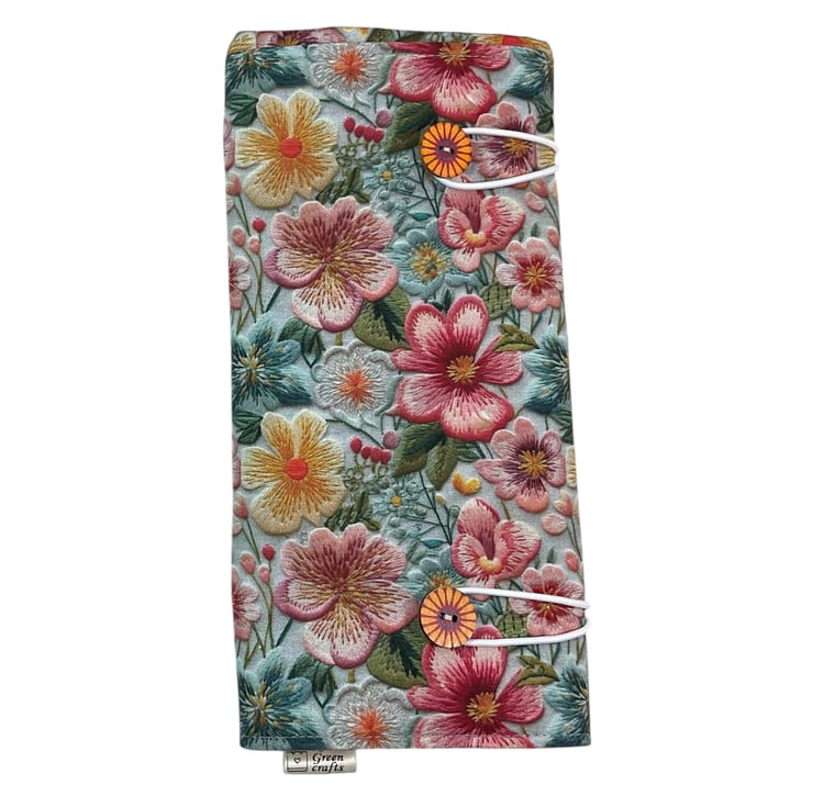 This case is made In pretty floral embroidery effect printed cotton fabric,in pretty shades on a light teal blue background.