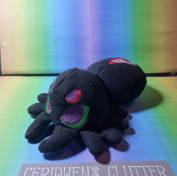 Plush in the shape of a Spider - it has an embroidered face and back design - the outer is fleece - the filling is polyester