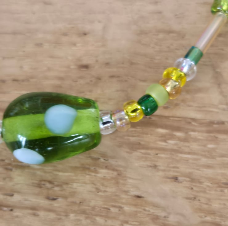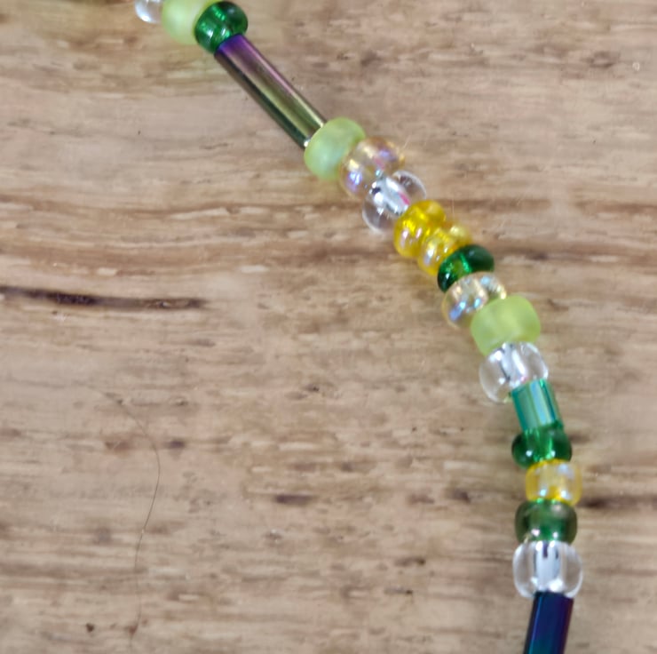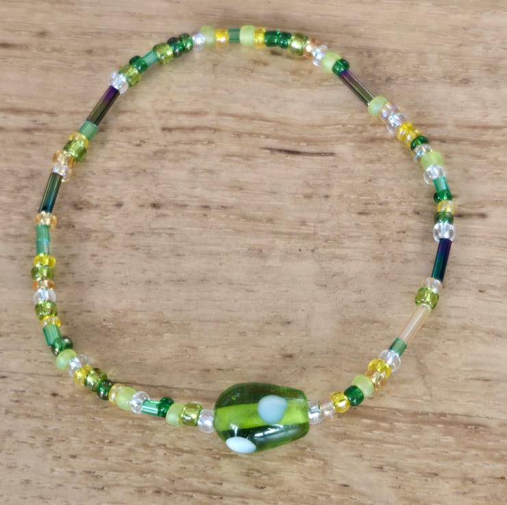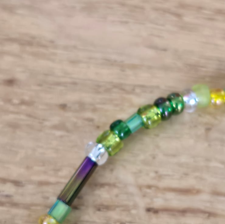 This is a stretch seed bead bracelet created using seed beads of different colours. Different shades of green, gold and silver seed beads are included. There is a beautiful green large bead added to the bracelet. This wrist band is approx 19 cms without stretch but can stretch to approx 30 am to get it over a hand. It is double stringed with jewellers stretch strong bead cord.