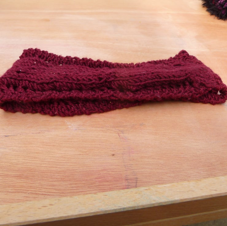 These earwarnnrs are handknitted in a lovely lacy pattern in burgundy acrylic wool. Lovely to keep warm and cosy on chilly days. The headband measures approximately 16 inches and can stretch to approximately 22 inches