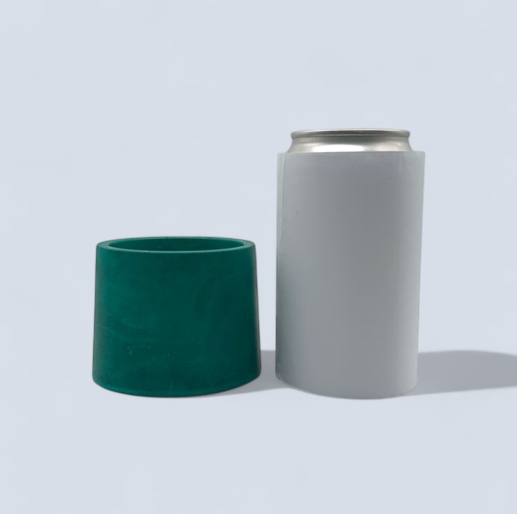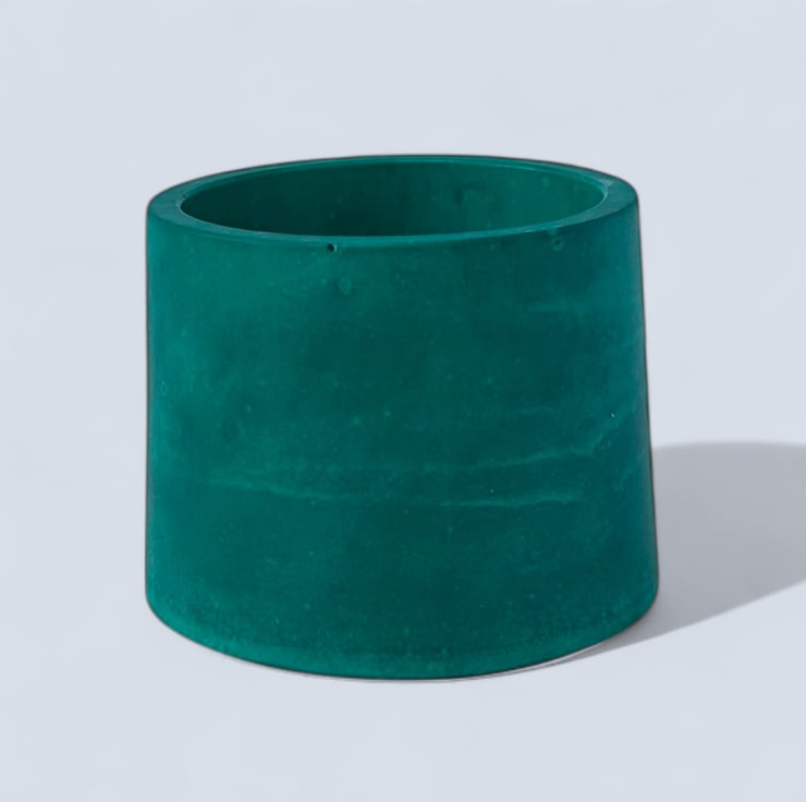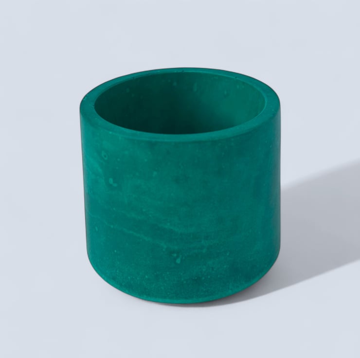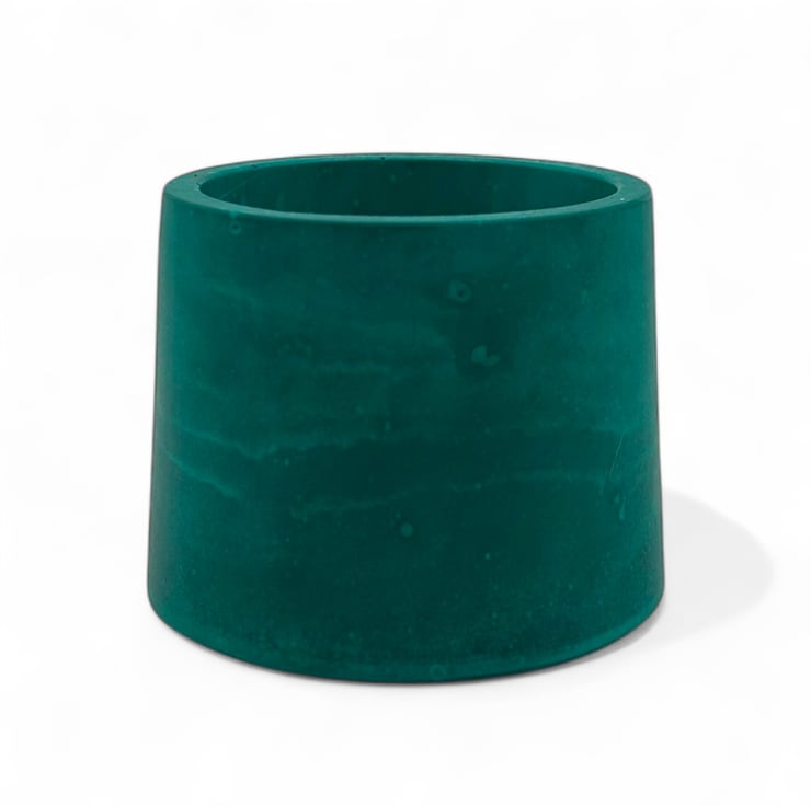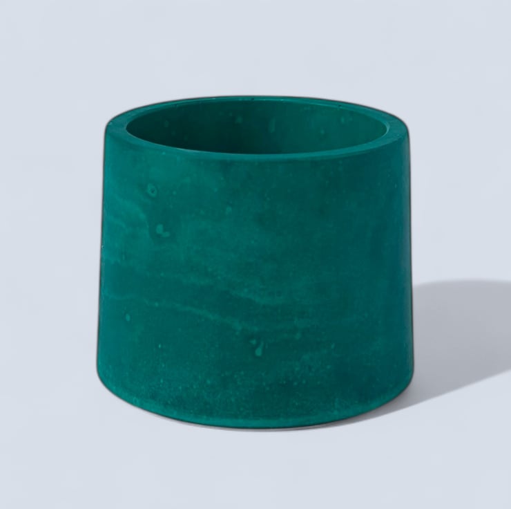 This small round plant pot is a vibrant jade green. It has a slightly tapered conical shape, with the top narrower than the base. It is handmade from Cassini, a material often used to restore and repair marble and stone. Cassini gives the pot a smooth and tactile finish while also being water-resistant. The pot’s small size makes it perfect for housing mini succulents, seedlings, or cuttings.