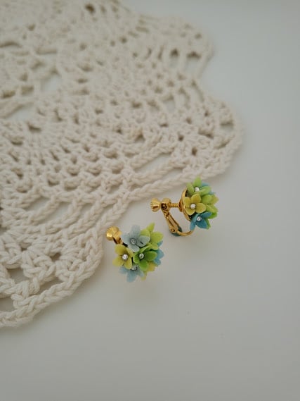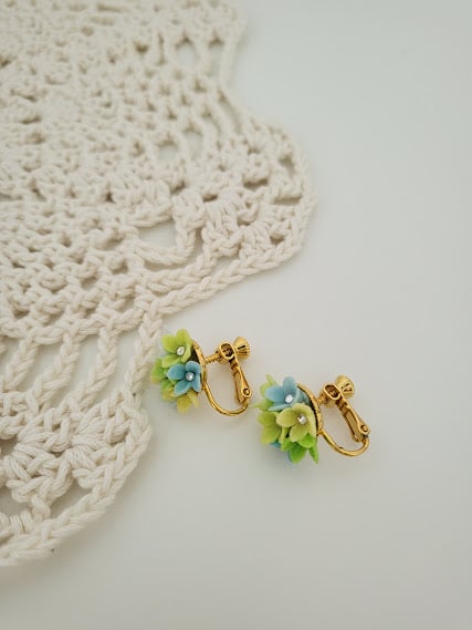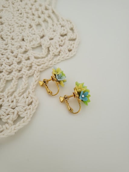 These charming screw-back earrings feature clusters of delicate hydrangea blossoms in soft pastel hues of blue, yellow and green , subtly sparkling with tiny crystal accents. Each earring gracefully with some sparkle crystal, offering an elegant and feminine touch for those without pierced ears.