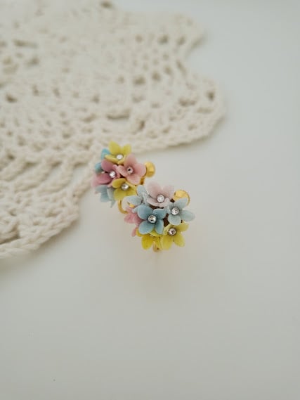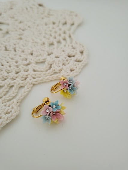 These charming screw-back earrings feature clusters of delicate hydrangea blossoms in soft pastel hues of pink ,blue and yellow, subtly sparkling with tiny crystal accents. Each earring gracefully with some sparkle crystal, offering an elegant and feminine touch for those without pierced ears.