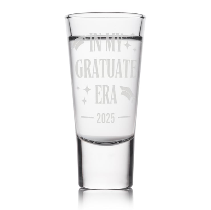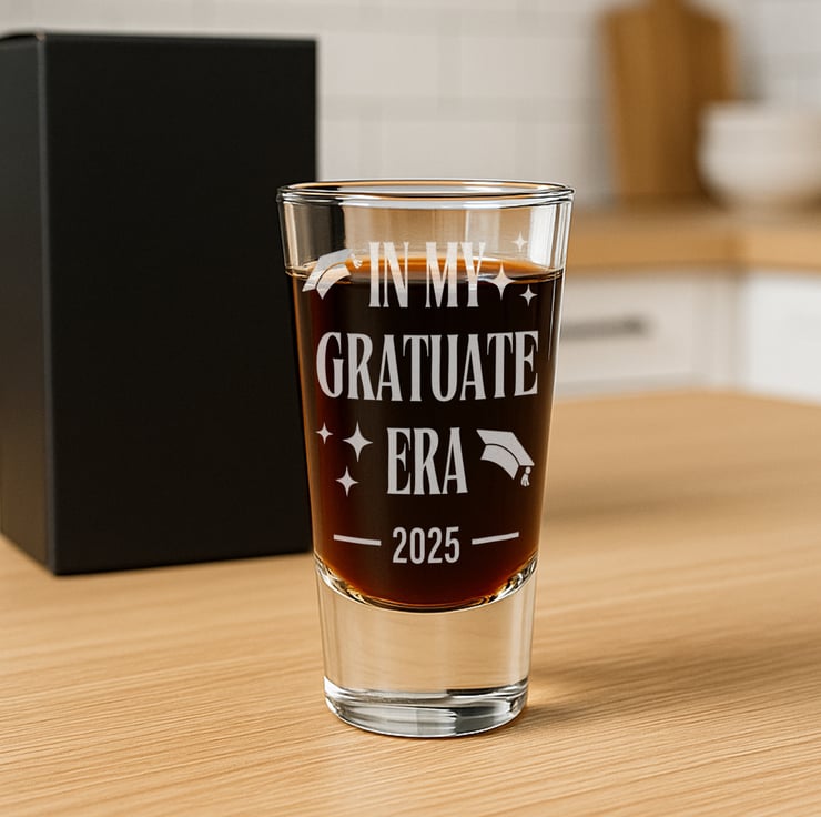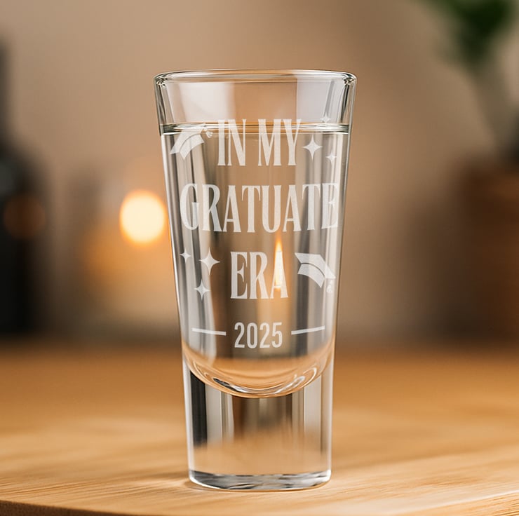 Celebrate their moment in the spotlight with this fun and stylish “In My Graduate Era” shot glass – the perfect tribute to a major milestone! Featuring engraved text, sparkles, and graduation caps, this trendy design is personalised with their graduation year for a keepsake they’ll cherish long after the last toast.