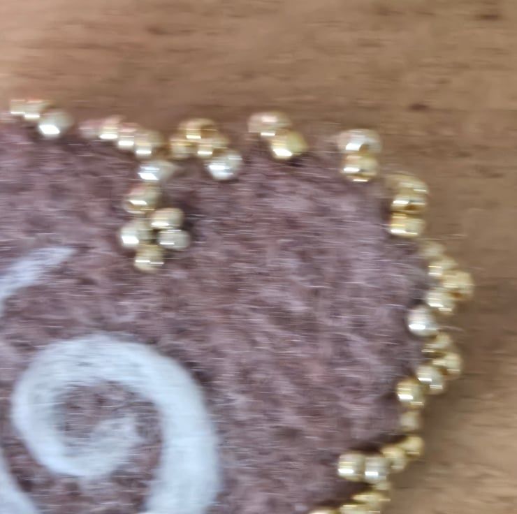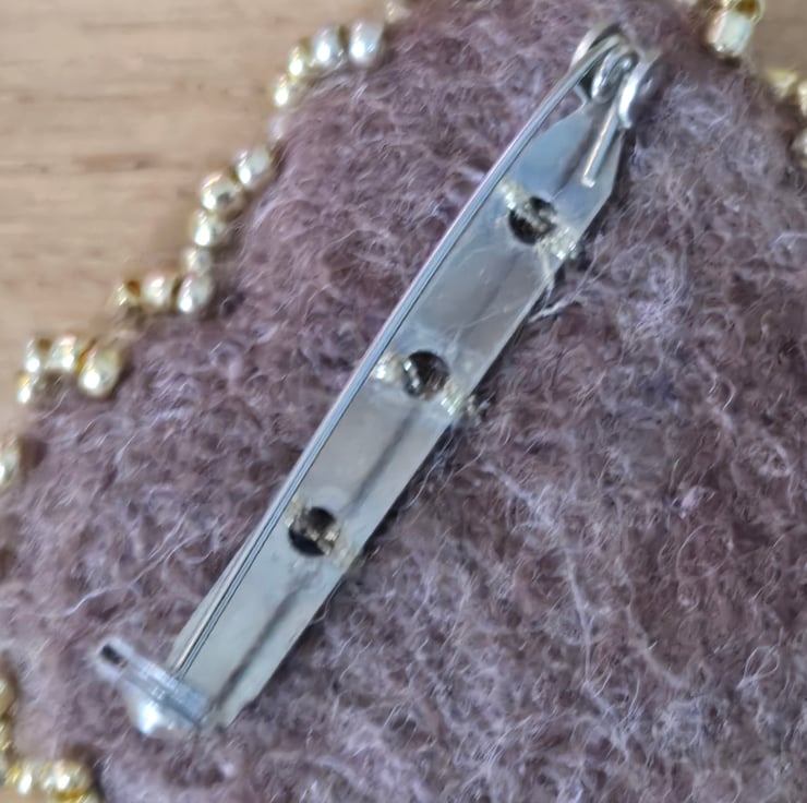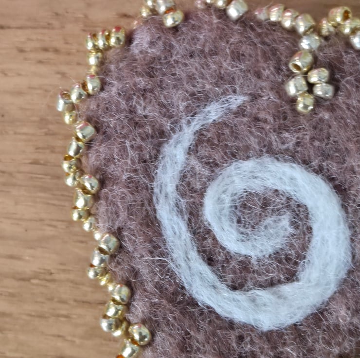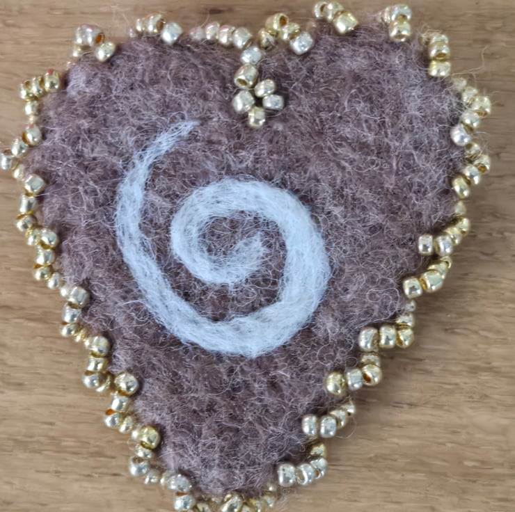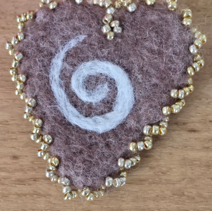 This is a needle felted brooch which has been felted into a heart and edged with golden seed beads. Brown wool has been used to needle felt and a swirl of white has been needle felted into the heart. It is approx 5 X5.5 cms in size at its biggest dimensions. At the back it has a safety latch pin at it back ensuring it can not be pull off your garment easily.